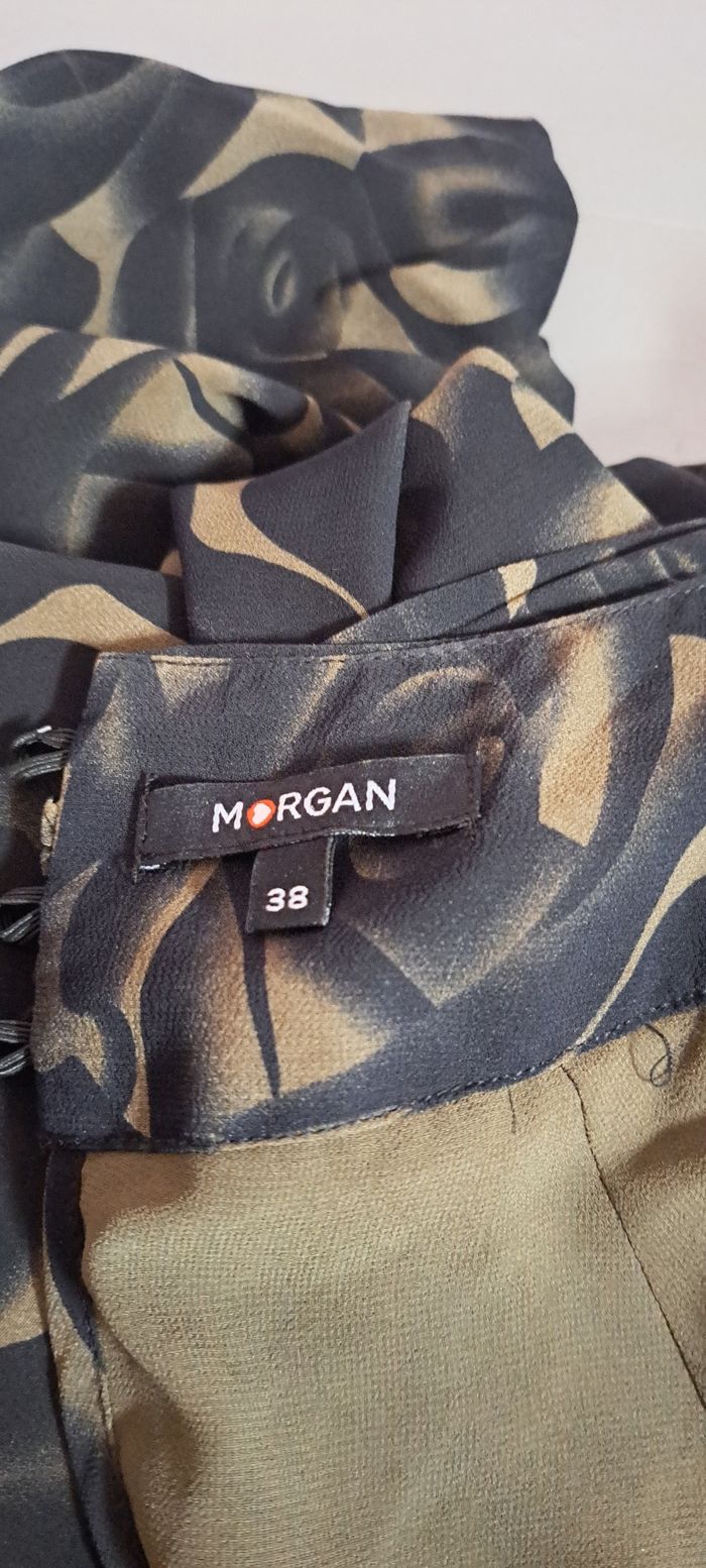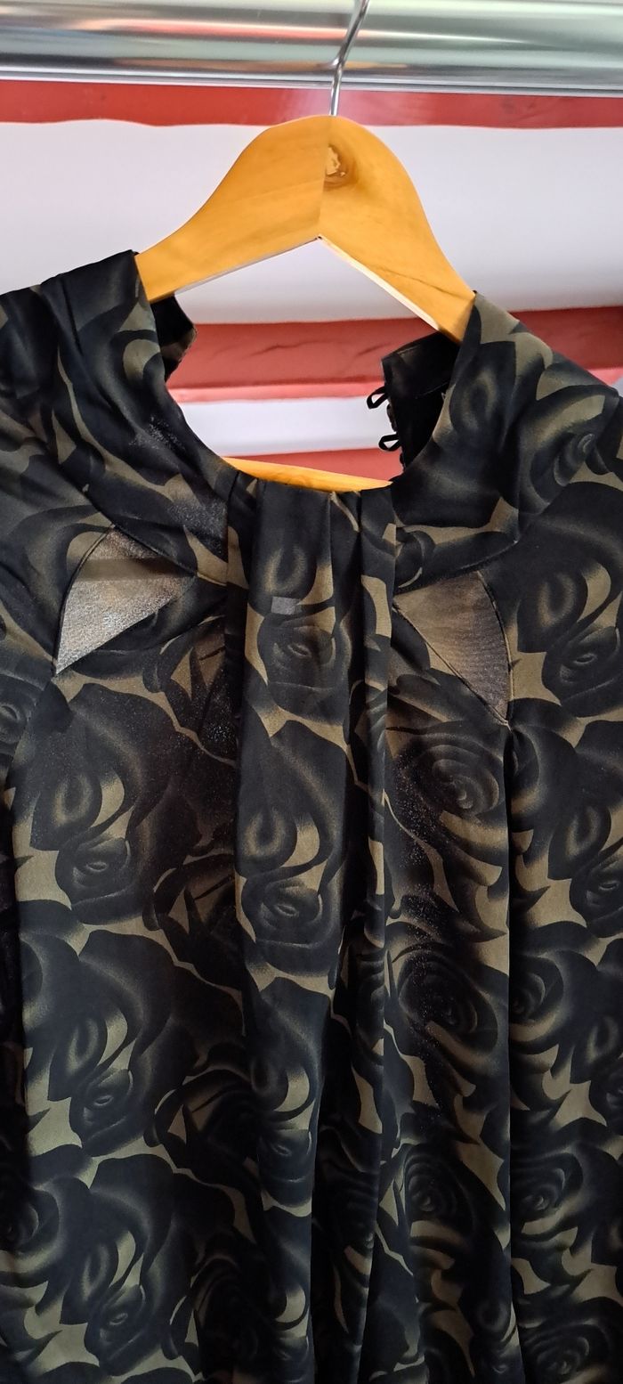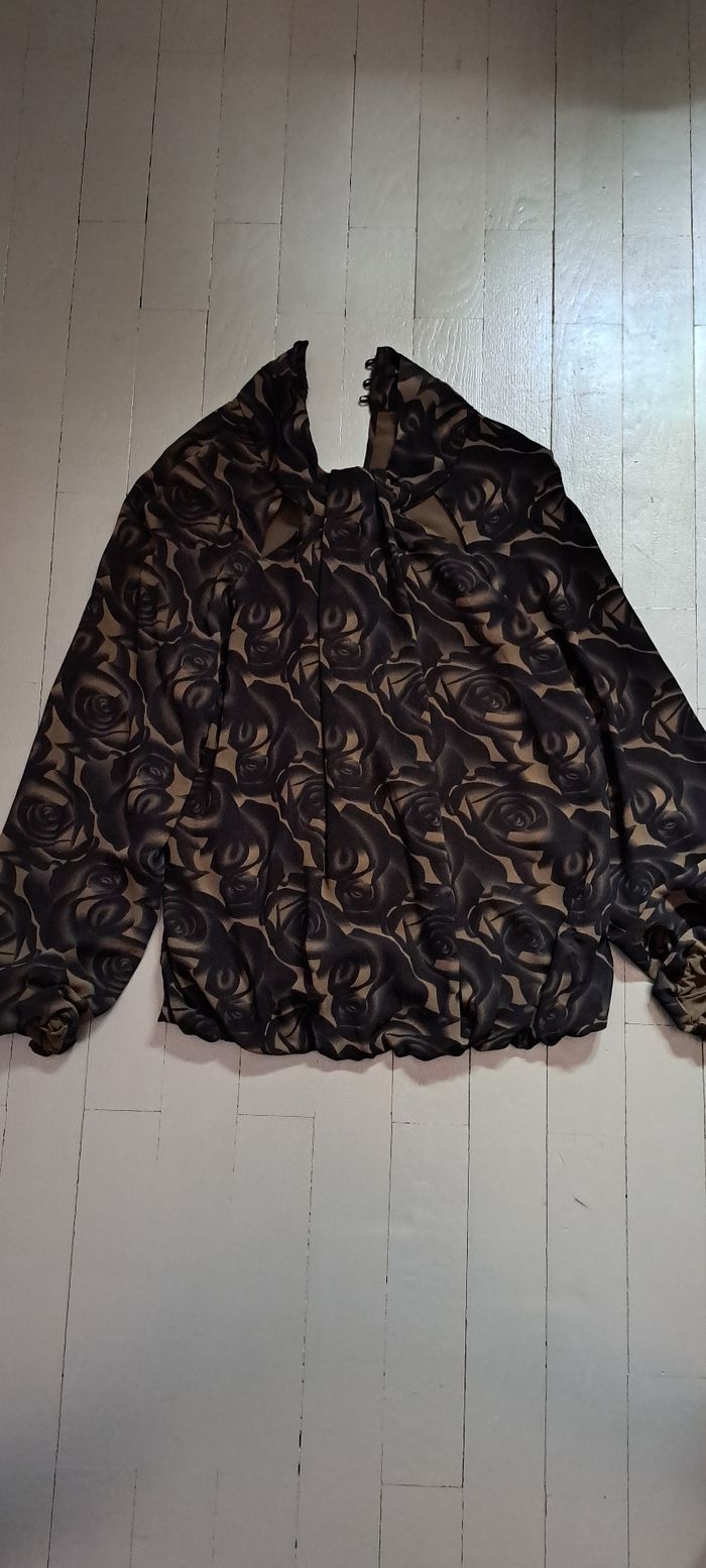 Jolie blouse motifs roses kaki et noire, attache par petits boutons au cou, découpe sur le décolleté devant et élastiquée à la taille, en parfait état, aucun défaut