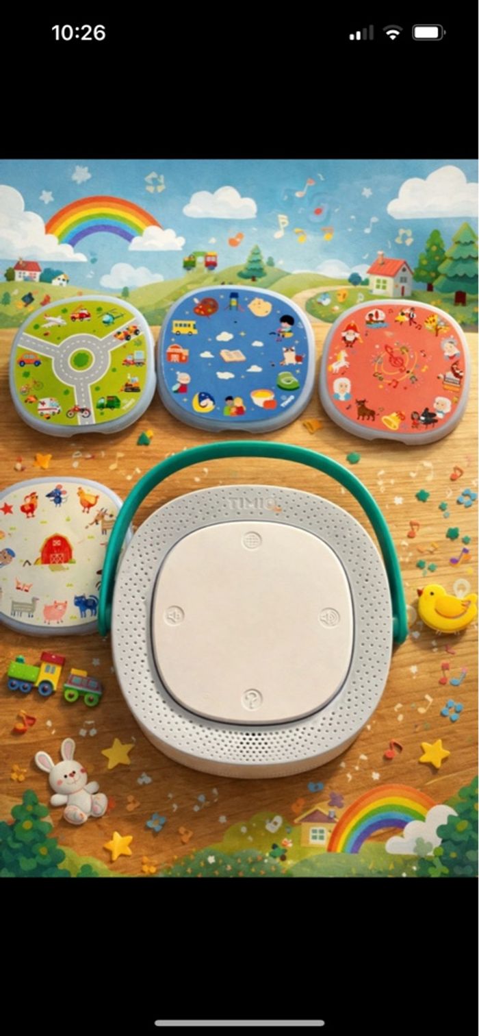 Lecteur audio éducatif Timio pour enfants, en très bon état. Vendu avec 4 disques thématiques permettant de découvrir des histoires, des sons, de la musique et d’apprendre en s’amusant. 🎧 Fonctionne sans écran 👶 Adapté aux jeunes enfants 📚 Ludique et éducatif 🔊 Son clair, utilisation simple Idéal pour stimuler la curiosité, le langage et l’autonomie des enfants, à la maison comme en voyage.