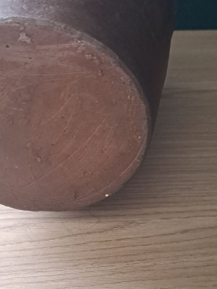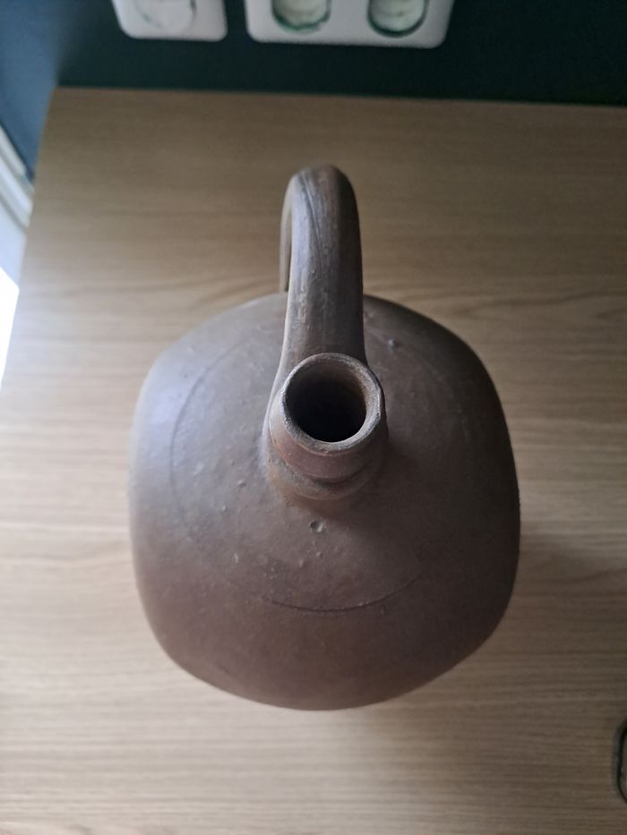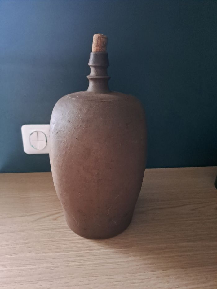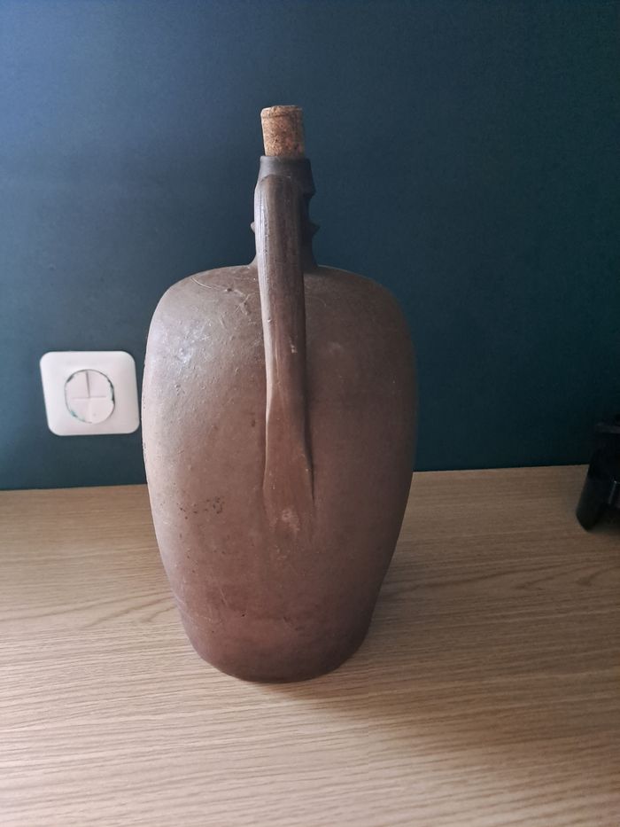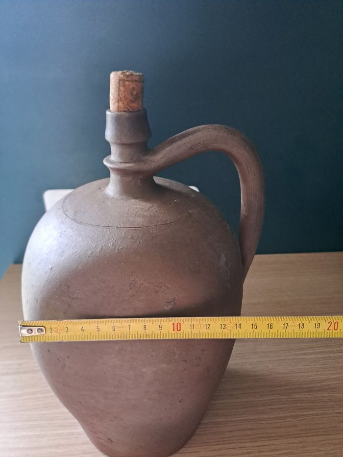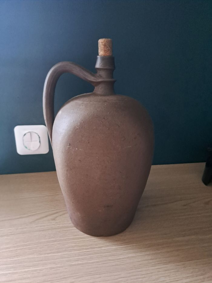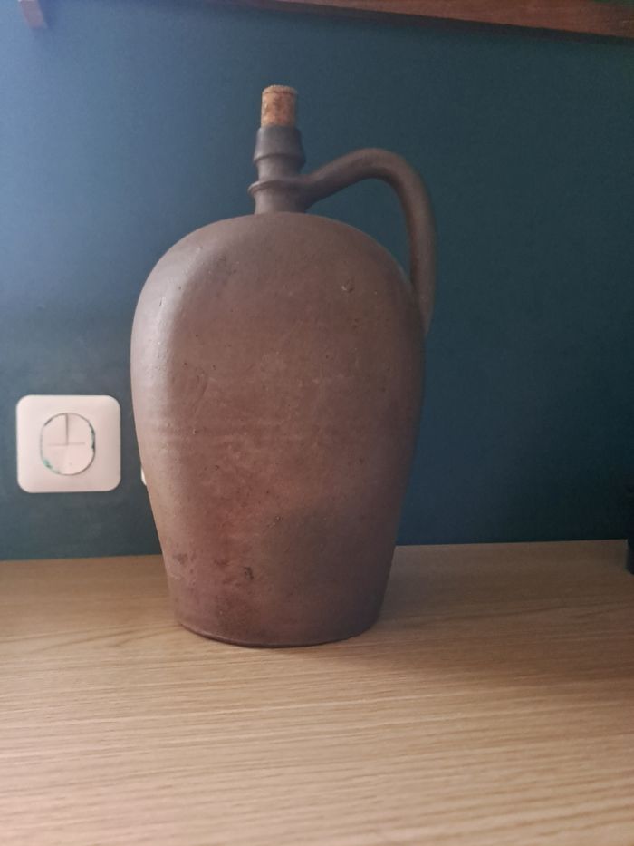 Gros cruchon Pichet ou cruche Vintage En grès ou terre cuite Quelques effet de matière Avec une anse Le bouchon est un bouchon de liège qui a été rajouté Couleur marron Un mini éclat en dessous (voir photo) Mesure en photo