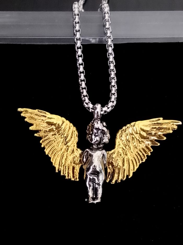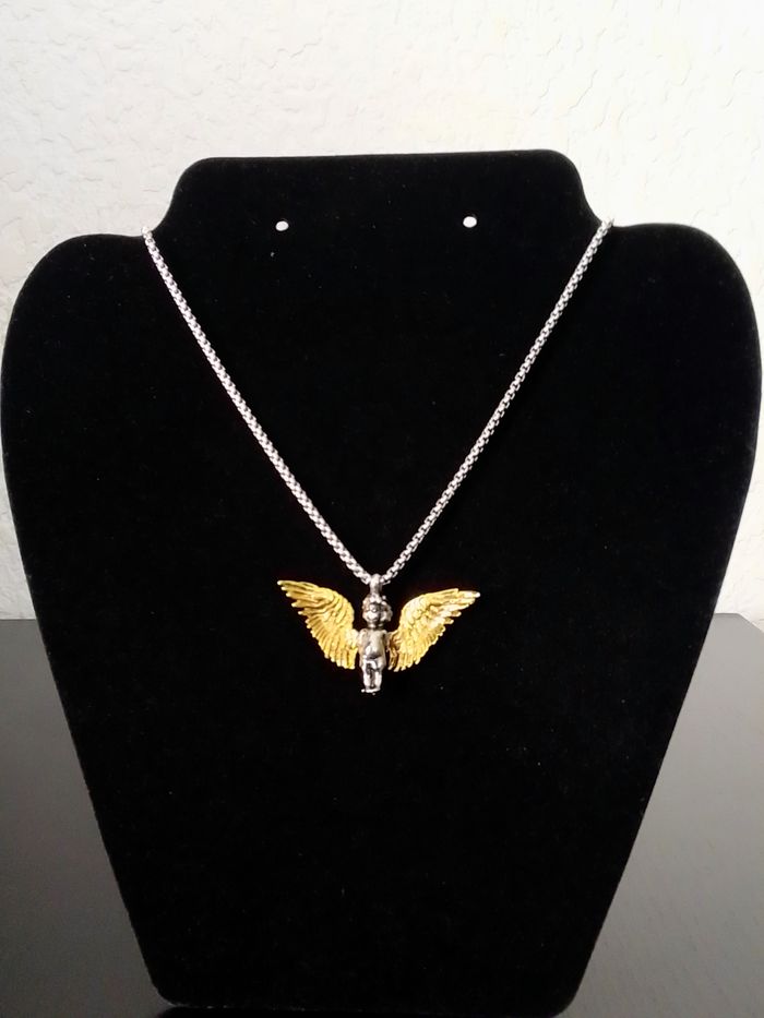 Chaîne + pendentif religieux. Pendentif : ange. (religieux, protection, spirituel, celtique, idéal cadeau) DESCRIPTIF : Couleur : argenté, doré. Taille chaîne : 60 cm Diamètre pendentif : 5 cm L * 3 cm H Envoi rapide et soigné.