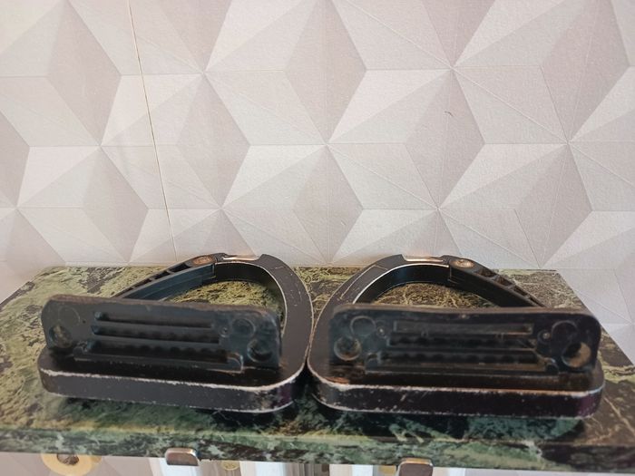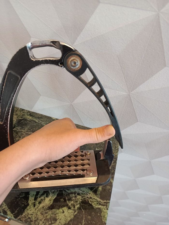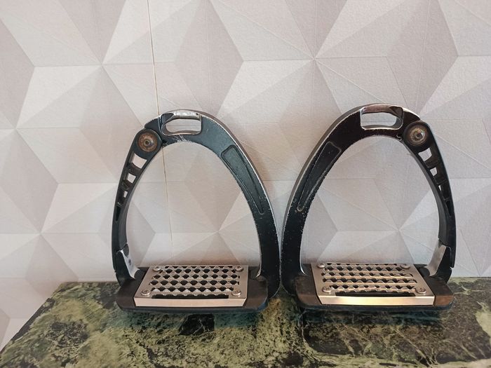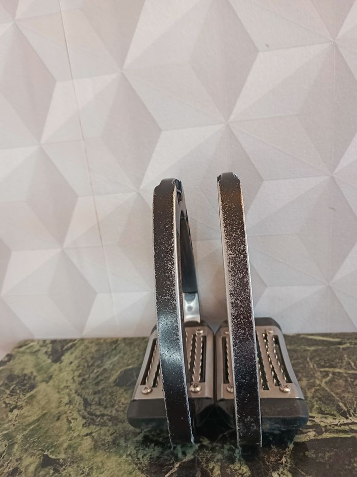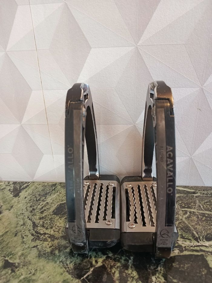 Êtriers de sécurité, marque Acavallo, taille adulte et adolescents, largeur du plancher 12 cm, longueur 5 cm, étriers droit a un dommage mais les êtriers restent complètement fonctionnelles