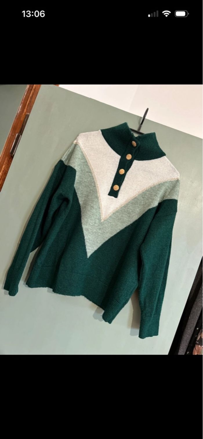 Vend Pull à col haut (les boutons peuvent être ouverts pour un effet col V) Porté 1 fois. Très bon état. Aucun accroc. Couleur vert sapin