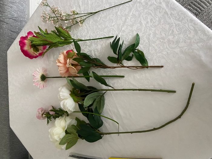 Vends un superbe lot de fleurs artificielles de haute qualité, idéal pour une décoration d'intérieur élégante, un mariage ou un événement. Les fleurs sont très réalistes, avec de belles finitions et des couleurs tendres. Le lot comprend 7 tiges au total : 3 Grandes Pivoines épanouies (1 blanche, 1 corail/pêche, 1 fuchsia éclatant). 1 Tige de Pivoine blanche plus compacte. 1 Renoncule rose délicate avec plusieurs têtes. 1 Grande Marguerite (Gerbera) blanc cassé et cœur rose. 1 Branche de Gypsophile rose pâle pour apporter du volume et de la légèreté. Points forts : État : Très bon état, fleurs propres et non décolorées. Réalisme : Pétales en tissu soyeux avec de jolis dégradés de couleurs. Pratique : Tiges modulables (peuvent être pliées ou coupées selon votre vase).