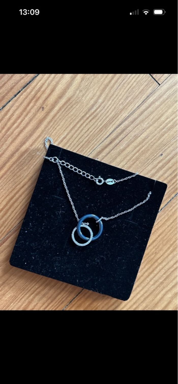 Bonjour, Je vends ce collier neuf jamais porté. 2 anneaux un diamanté et l’autre couleur bleu foncé. Argent 925 Marque carré d’or