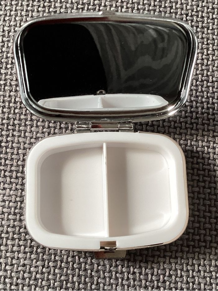 Pilulier rectangulaire, 2 compartiments, de 5,5 x 4 cm, ouverture par bouton poussoir