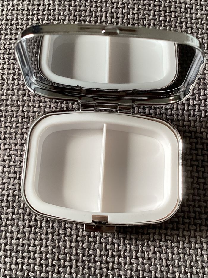 Pilulier rectangulaire, 2 compartiments, de 5,5 x 4 cm, ouverture par bouton poussoir