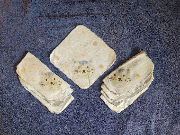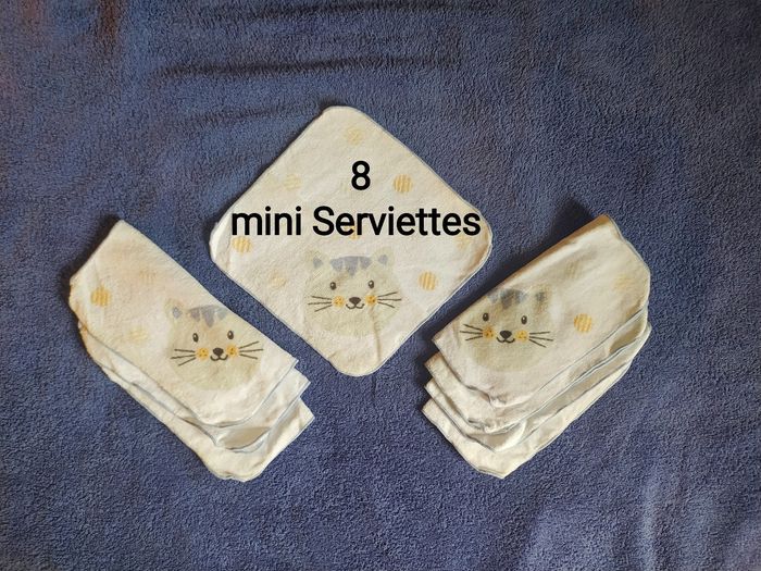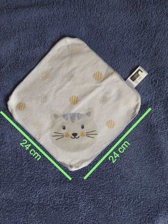 ⚠️Envoi à partir de 5€ d'achat⚠️ Lot de 8 Mini Serviettes Chat dimensions: 24x24cm en 100% coton éponge bio marque: Home Création 1 face blanche avec motif tête de chat et ronds, 1 face blanche unie sorte de Barbouillettes, idéal à avoir près de la chaise haute, dans le sac à langer ou sac à main 😀 grâce à leurs petites tailles Très bon état ⚠️Envoi à partir de 5€ d'achat⚠️
