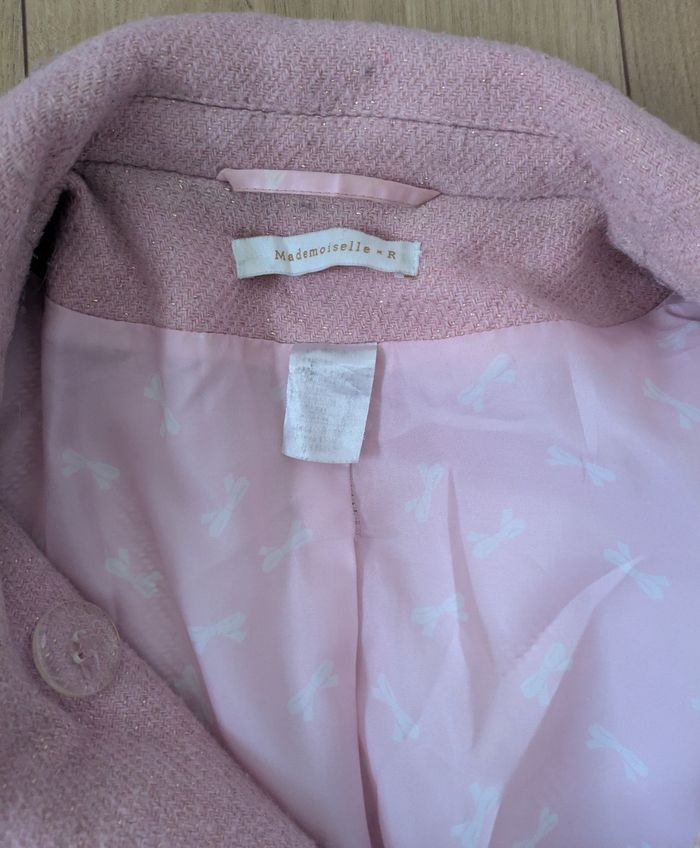 Manteau mi saison , de couleur rose poudré avec paillettes. Porté plusieurs fois . Marque Mademoiselle R , taille 44. Quelques bouloches qui peuvent s'enlever. Très féminin.