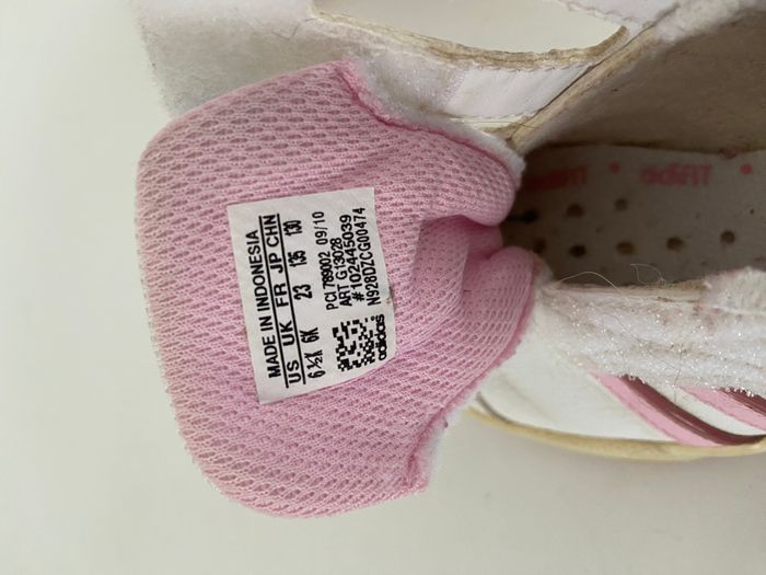 Vends une paire de baskets Adidas authentiques pour petite fille. Modèle blanc avec les trois bandes iconiques et détails en rose pastel/fuchsia. Pointure : 23 (FR) / 6K (UK). Fermeture : Large bride auto-agrippante (scratch) unique, très pratique pour chausser l'enfant rapidement et assurer un bon maintien. État : Bon état général. Les chaussures ont été portées mais sont propres. À noter une légère décoloration naturelle de la semelle (jaunissement vintage) qui n'affecte en rien la solidité. Détails supplémentaires : Semelle intérieure avec technologie Adifit pour vérifier si la pointure est toujours adaptée au pied de l'enfant. Fabriquées en Indonésie. Idéal pour l'apprentissage de la marche ou pour un look sport décontracté au quotidien.