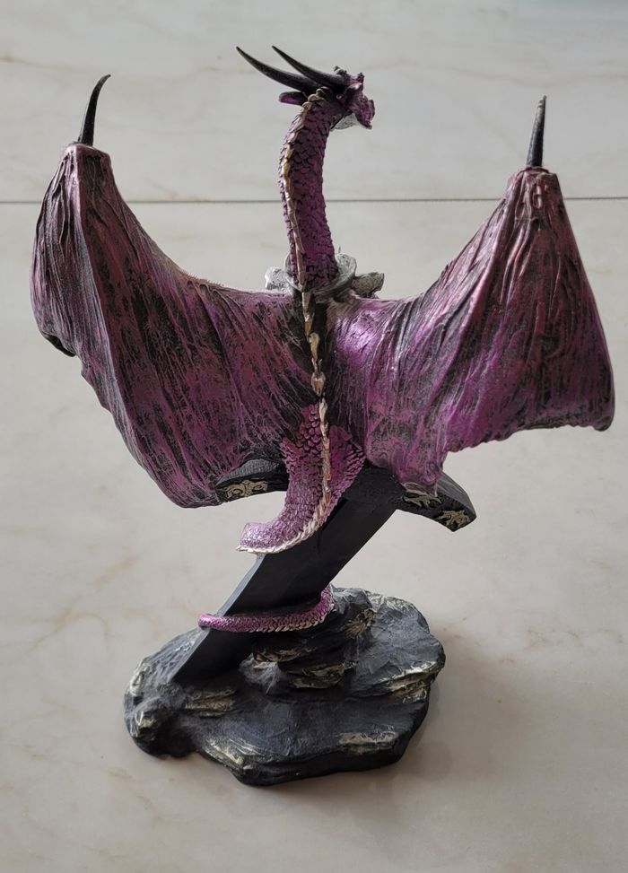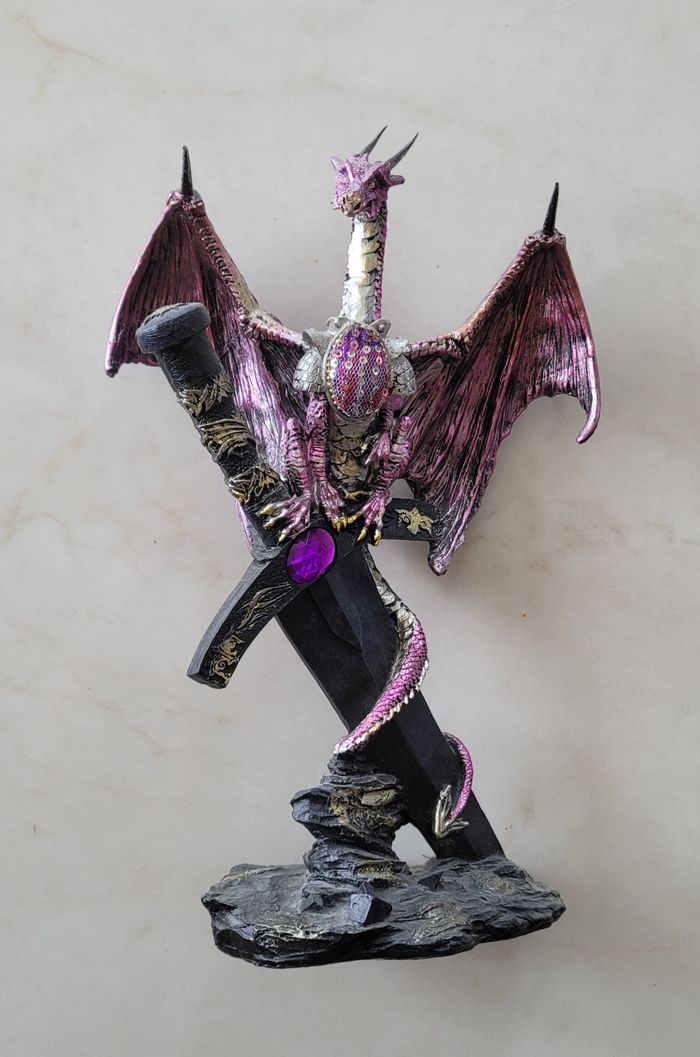 Je vends cette magnifique sculpture décorative représentant un dragon médiéval sur un poignard. Cette sculpture a été achetée à la célèbre fête médiévale de Santa maria da Feira au Portugal la plus grande fête médiévale d'Europe. Elle a été peinte par un créateur local. - Type de produit : Sculpture décorative - Style : Médiéval / Fantastique - Matière : Autre - Couleur : Noir et violet - Dimensions : Hauteur environ 30 cm État neuf N'hésitez pas à me contacter pour plus d'informations ou de photos.