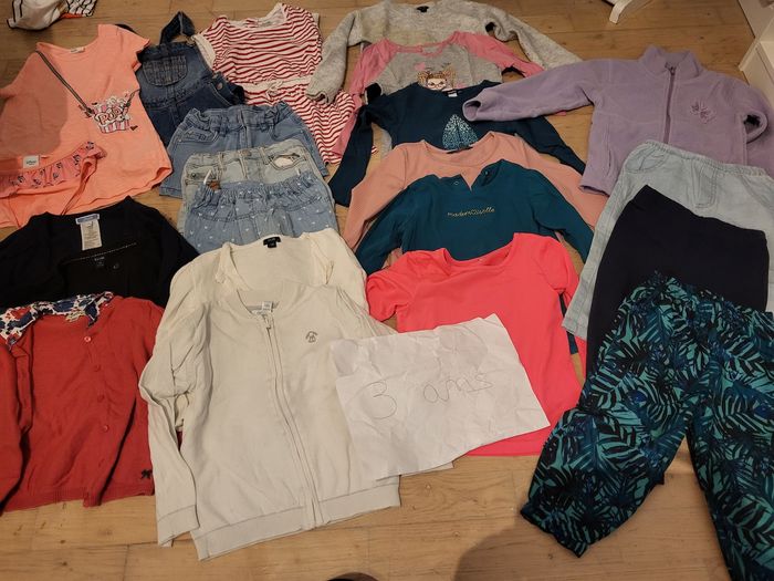 Lot 3 ans : 3 gilets , 3 short , 1 bas de maillot se bain , , 2 robes , 1 combishort jean , 1 pull , 5 tee shirt manche longue , 1 polaire , 1 jean et 2 pantalon