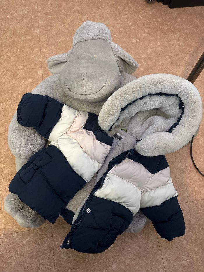 Manteau avec capuche qui peut se retirer grâce a ces pressions Moumoute à l’intérieur Taille 12 mois Blanc/rose et bleu marine