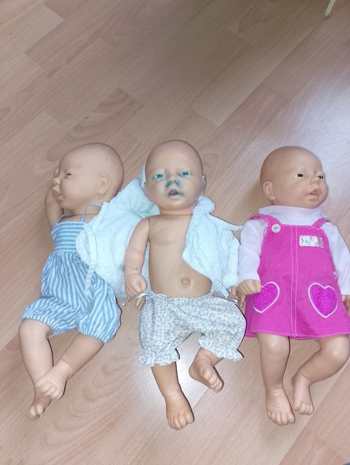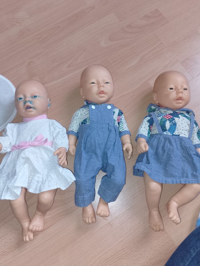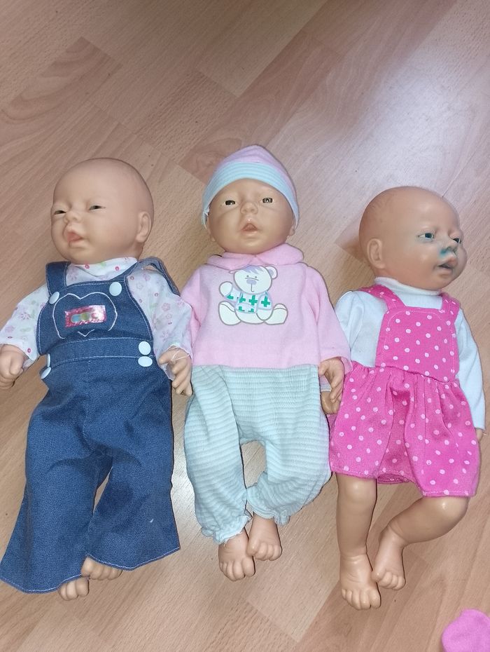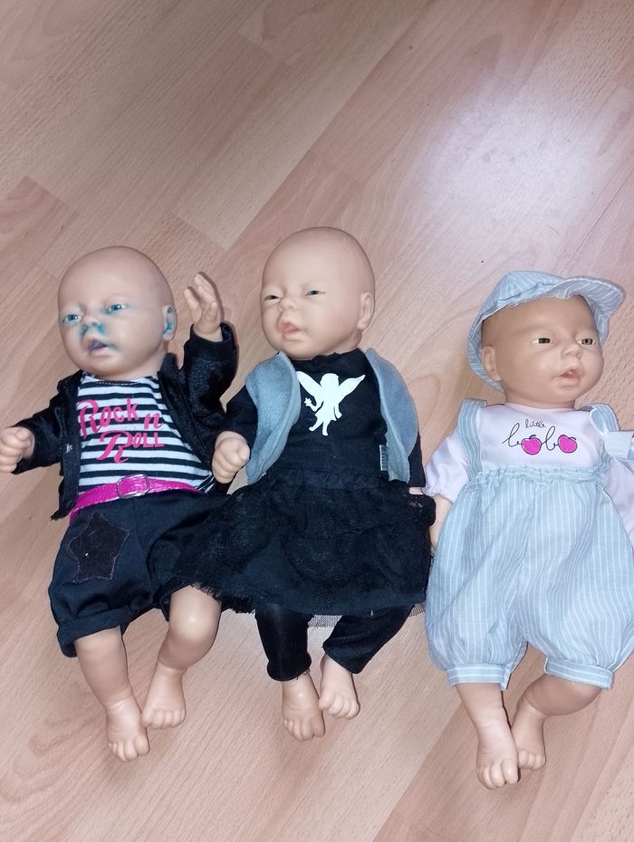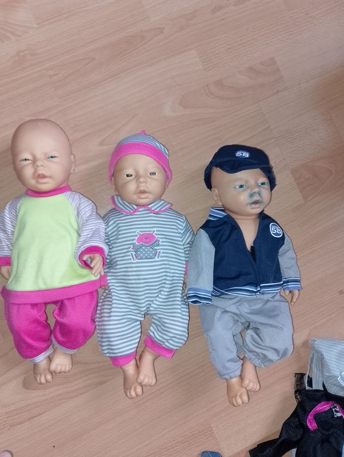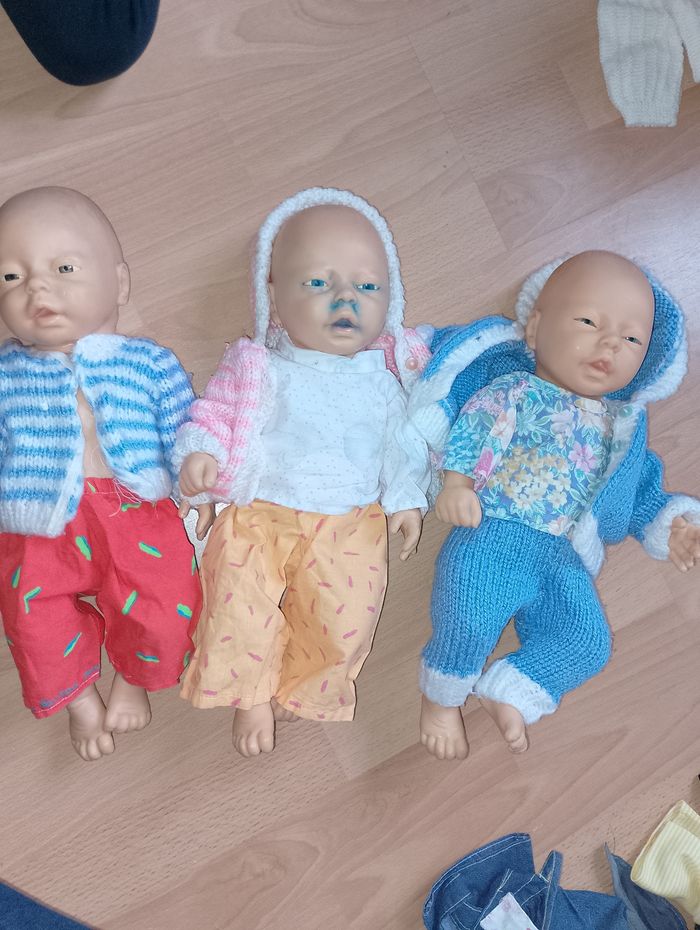 Vêtement poupon 45cm (nénuco) Ensemble ou combinaison 12€ pièce Différentes prix et tenu complète où juste séparé * Robe blanche bord rose ( prévoir un nouveau scratch) fait main * Salopette bleu (1 tâche de feutre en bas, et t-shirt Chipie 1 scratch à réparé fait main * Robe marine et haut écru Chipie 1 scratch à réparé fait main * Kimono blanc et rose veste et pantalon 69394 * Pyjama bleu avec bonnet * Pyjama rose avec bonnet * Combinaison rose cochon one size * Combi ourson one size * Combi licorne ( manque curseur pour refermé) * Ensemble t-shirt faux pull jaune vert blanc emavec son pantalon et son bonnet * Pyjama d'origine rose NENUCO * Pyjama rose avec 3 fleurs avec son bonnet * Survêtement pantalon rose et son pull vert et rose * Pyjama gris rayures blanches avec son bonnet * Survêtement veste marine pantalon gris et bonnet 106505 * Gilet laine bleu et blanc fait main scratch à réparé * Pantalon rouge orange fait main * Gilet rose et blanc fait main prévoir quelques réparations * Tshirt blanc pois rose manque 1 attache fait main * Pantalon orange trait rose haut assortie mais un peu large pour un 45cm fait main * Pantalon laine et gilet bleu avec bord blanc, t-shirt fleuri refaire scratch fait main Ensemble * Salopette jean's avec t-shirt blanc fleuri 718590 * Pyjama rose avec rayures sur le bas un peu large pour un 45cm * Robe rose à pois avec t-shirt blanc * Tshirt rockn'roll pantalon blanc et Boléro noir 106505 * Robe jean's avec t-shirt jaune * Pull vert capuche avec pantalon kaki * Short et veste noir et t-shirt noir et blanc a rayures Rock n'roll 106505 * T-shirt fée, jupe et leggin's (abîmé )noir et Boléro gris * Salopette et casquette a rayures grise et blanches et t-shirt rose little bobo * Salopette bleu et blanche à rayures fait main ( remettre petits scratch) * Gilet réversible blanc fait main * Robe rose foncé coeur et t-shirt rose clair Poupon nenuco dispo à la vente 25€ pièce 2 garçons, 1 fille