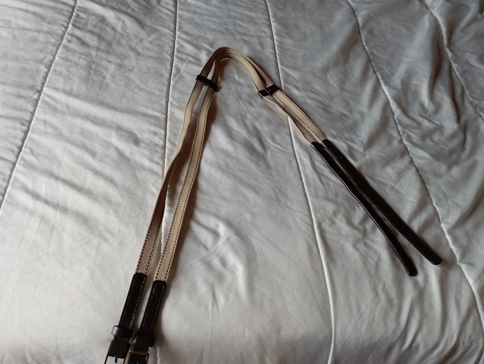 ceinture souple beige et marron longueur : 112 cm je n'ai pas trouvé de marque en bon état (le frottement a enlevé, côté intérieur, à côté d'un trou un tout petit revêtement, reste très discret) pour plus de renseignement(s) et/ou photo(s), n'hésitez pas à me faire un message j'étudierai toute proposition que vous me feriez