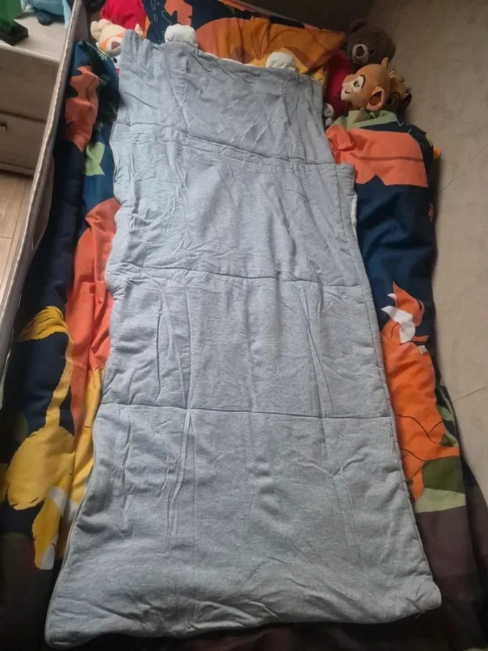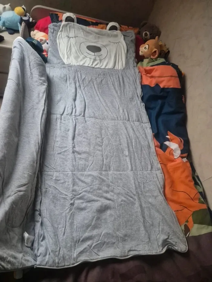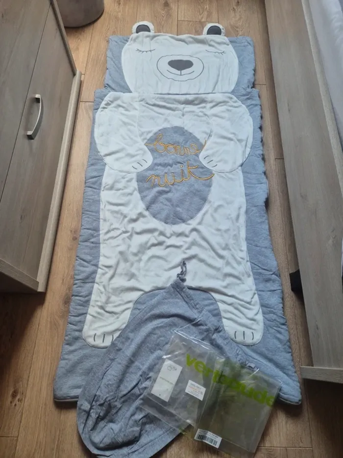 JE N'ACCEPTE PAS D'OFFRE MERCI Sac de couchage enfant S'ouvre complètement et peut se transformer en couverture vertbaudet blanc et gris motif ourson (motif blanc tout doux) Longueur totale : 138 cm X 62 cm de largeur environ en parfait état, très très peu utilisé (siestes du centre de loisirs d'été, soit une dizaine de fois) Couleurs vives, sans tâches vendu avec son sac de transport et son emballage d'origine