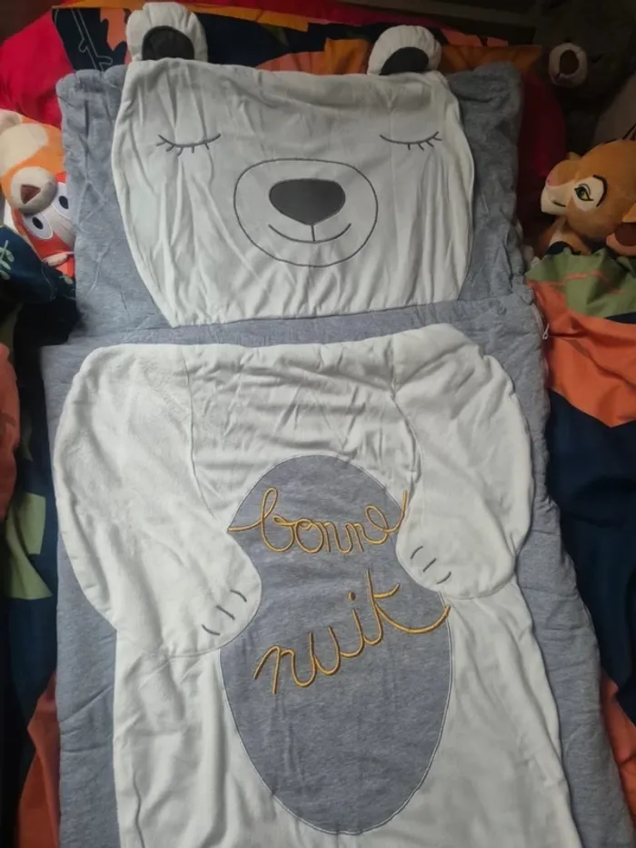 Sac de couchage enfant vertbaudet blanc et gris motif ourson en parfait état - photo numéro 3