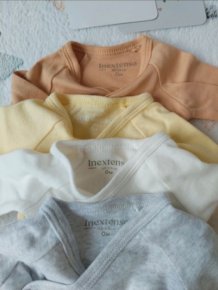 Lot de 4 bodies naissance ( 0 mois ) Ouverture sur le devant Taille 📏 : 49-53cm Marque : In extenso Le jaune et le beige sont neuf Le gris et le blanc porté une fois à la maternité Donc le tout en parfait état 🌸