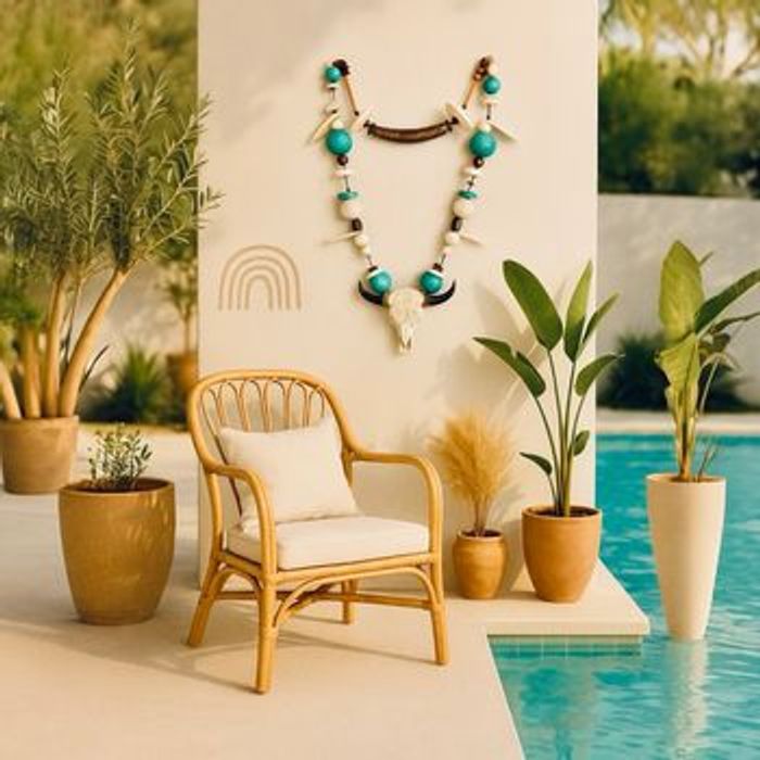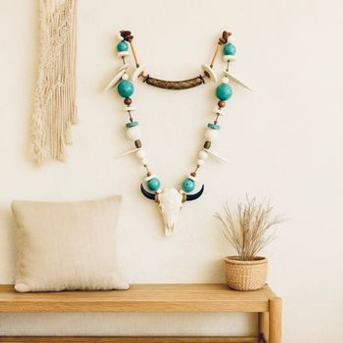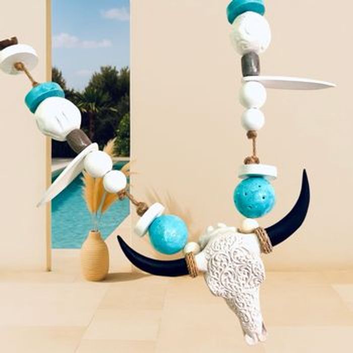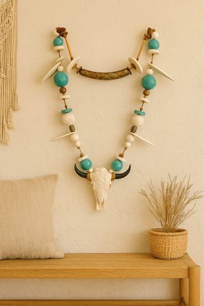 Ce bijou mural unique est une véritable œuvre artisanale qui raconte une histoire. Composé de perles d’argile façonnées et peintes à la main, de perles en bois naturel, et d’une tête de buffle décorative, il sublime vos espaces avec force et poésie. Idéal pour une décoration murale dans un salon, une chambre, une entrée ou même sur une terrasse abritée, il s’accorde avec les univers bohème, wabi-sabi ou esprit nature. Chaque détail a été pensé pour créer une pièce pleine de personnalité.