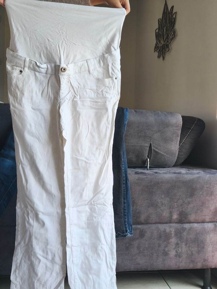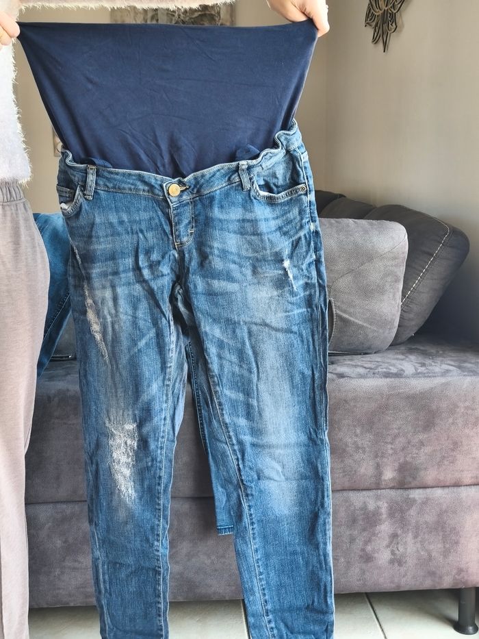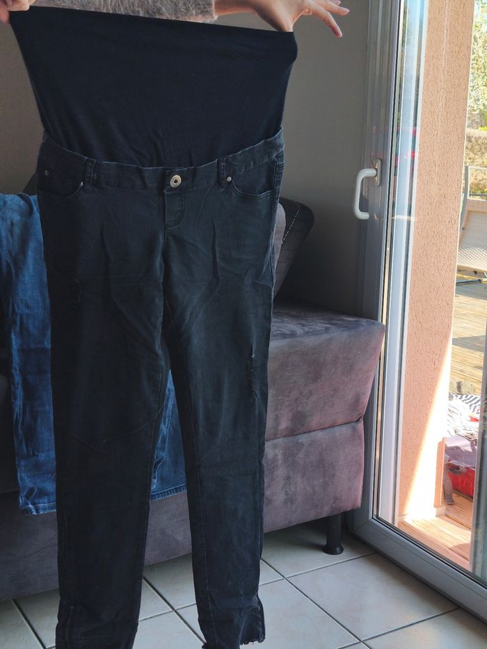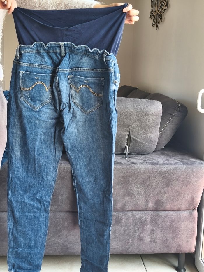 Lot de vêtements de grossesse t42. 4 jeans , un bandeau, un pull et une robe . Bon état (froissé car stocké dans une valise) . Juste la fermeture du pantalon noir cassé sur la cheville . Différentes marques . Kiabi, la halle , Verbaudet, orchestra)