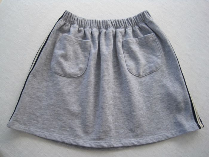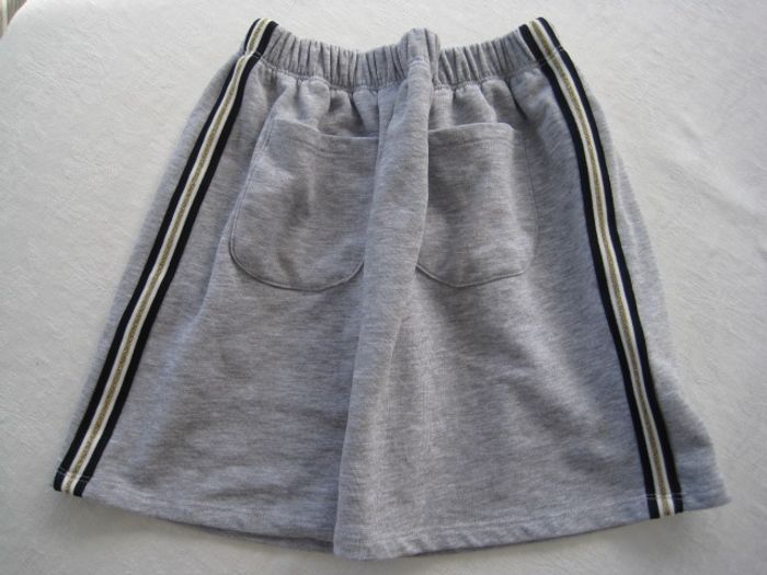 Jupe style tennis en coton et polyester, gris clair avec bandes noires et dorées sur les côtés. Taille élastiquée Marque Kiabi Taille 10 ans, longueur 35 cm Excellent état