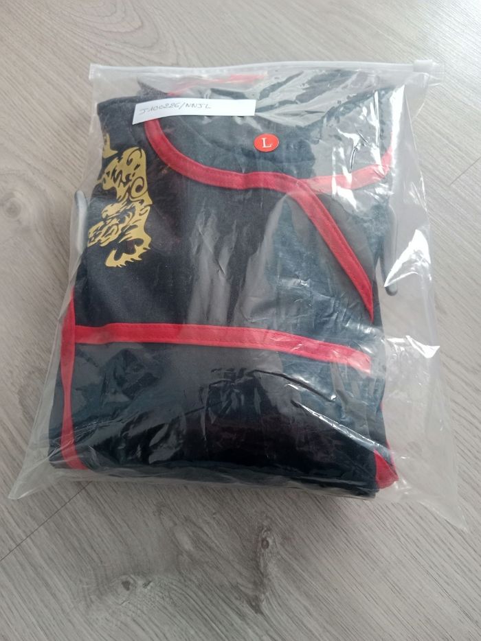 Costume de ninja noir et rouge. Taille 8/10 ans. Contient : une combinaison (105 cm), 4 rubans, une ceinture, une cagoule, une paire de mitaines et les accessoires.