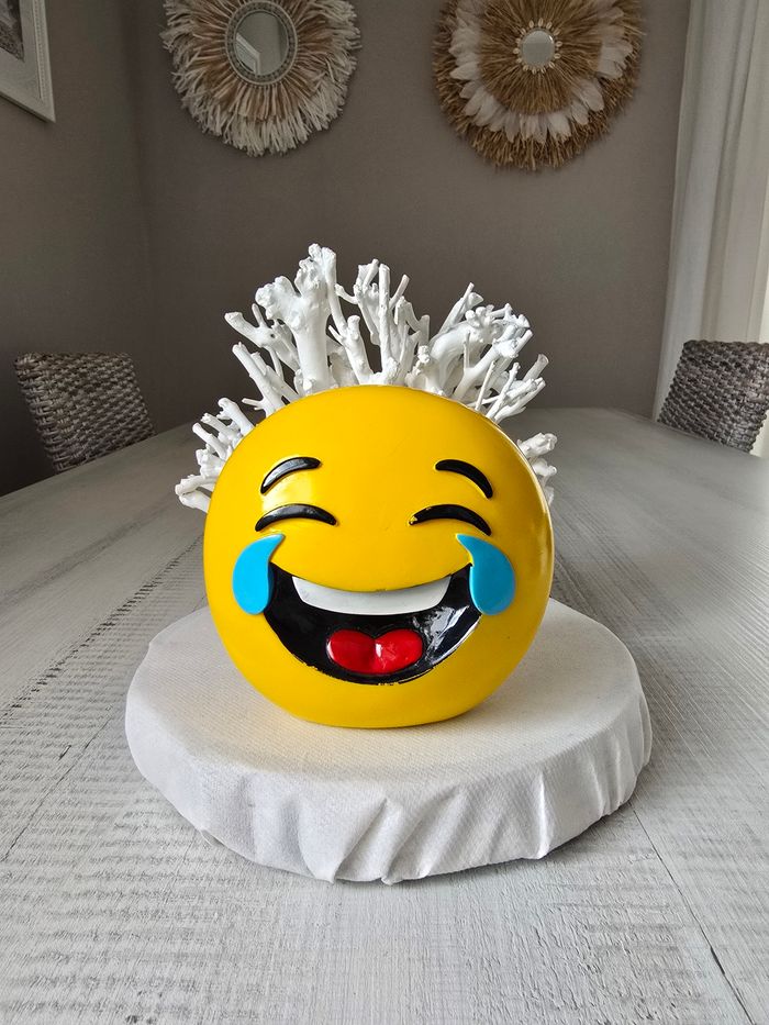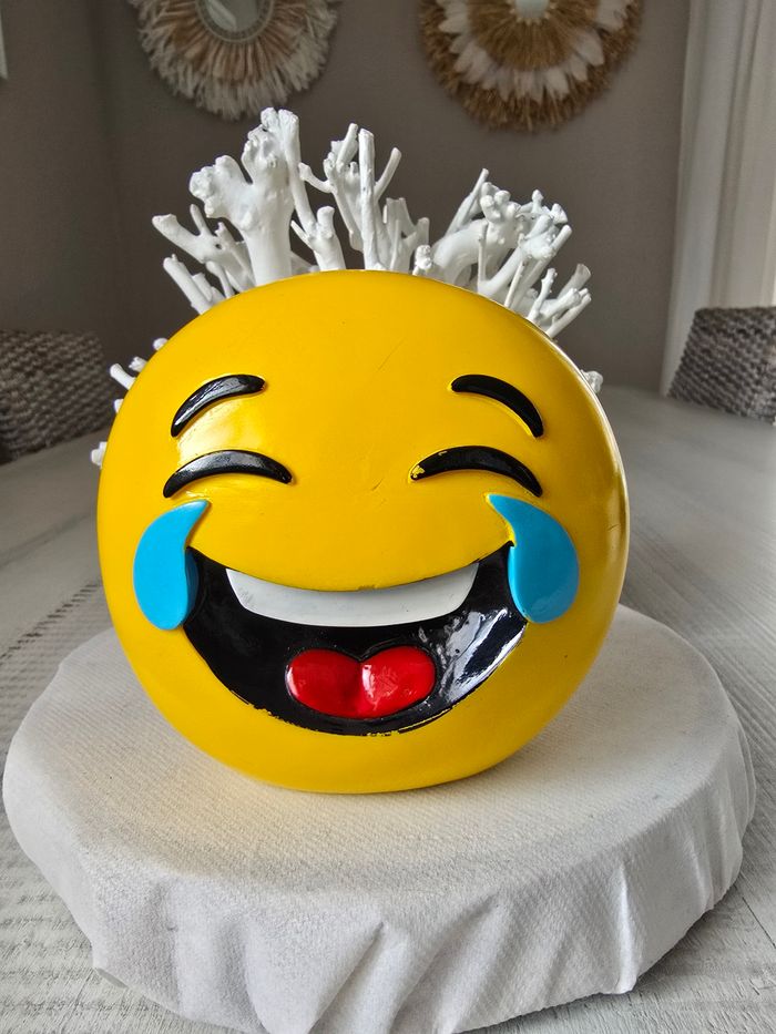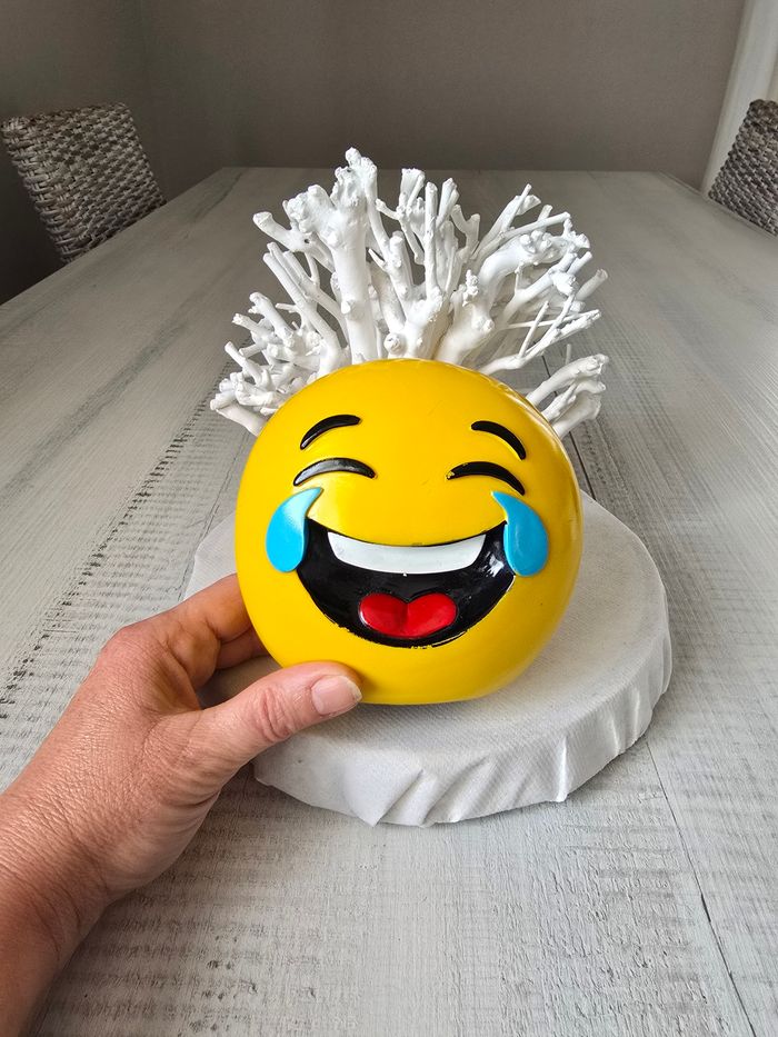 Tirelire emoji qui rigole Hauteur 13 cm Largueur 13 cm Très bon état juste un peu de noir parti au niveau du sourcil et de la bouche voir photos