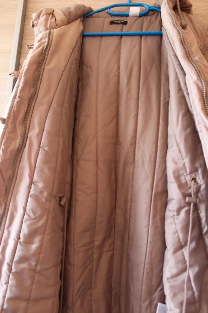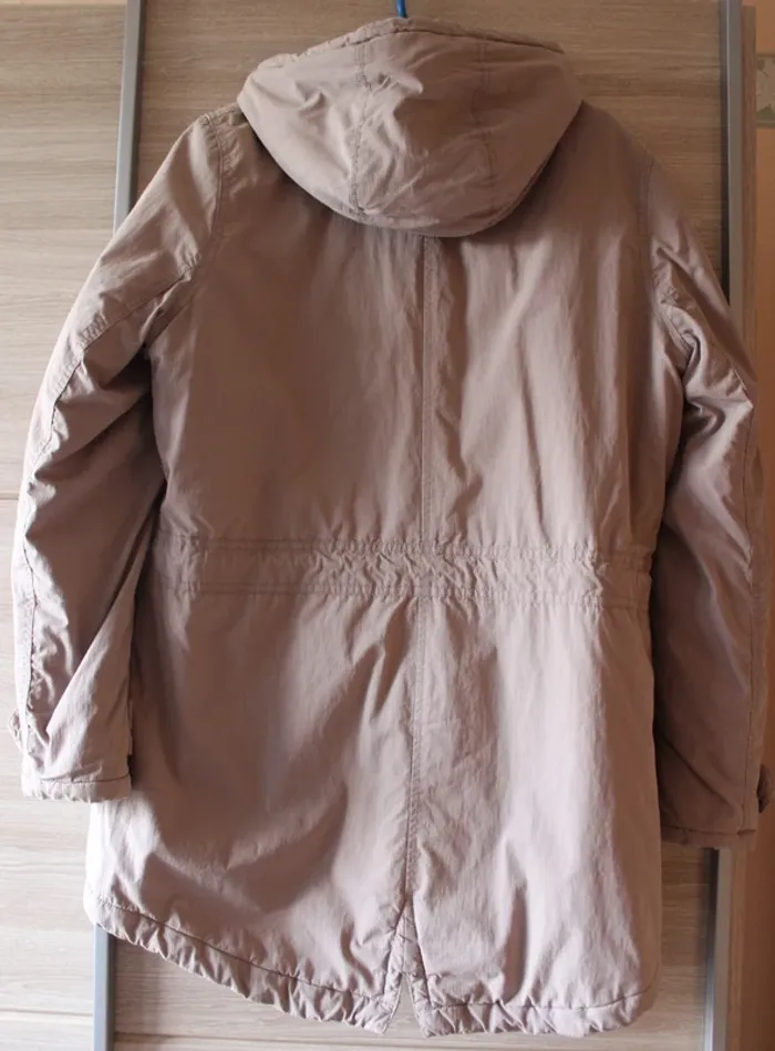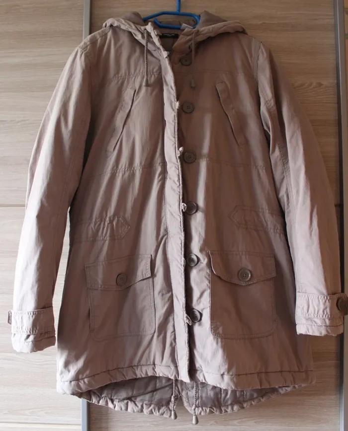 Manteau femme beige avec capuche, doublé Manteau bien chaud Lien avec cordon à l'intérieur pour serrer la taille éventuellement Se ferme avec fermeture et boutons Longueur mi-cuisses Taille 42 Marque LA REDOUTE Très bon état
