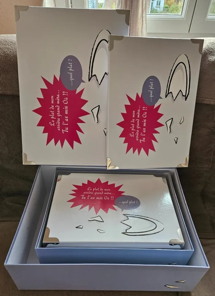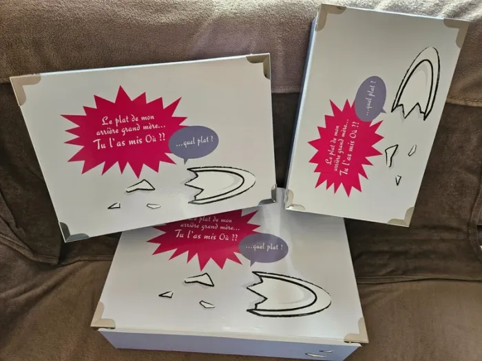 Lot de 3 grandes boîtes de rangement Gigognes avec couvercle, empilable, en carton. Angles et poignées en métal. Taille : 52 x 36,5 x 17 cm ; 44 x 31 x 17 cm ; 40 x 26,5 x 17 cm Comme neuves, jamais utilisées Prix : 12 € Pas d'envoi - Remise en main propre uniquement