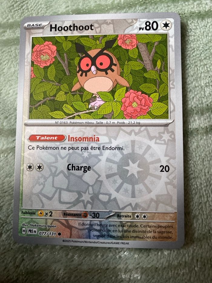 Hoothoot, probablement issue de la série Écarlate et Violet Évolutions Prismatiques. Nom du Pokémon : Hoothoot Type de carte : Commune (077/131) Talent : Insomnia (Ce Pokémon ne peut pas être Endormi) Attaque : Charge (20 dégâts)