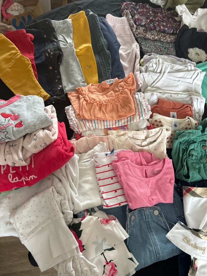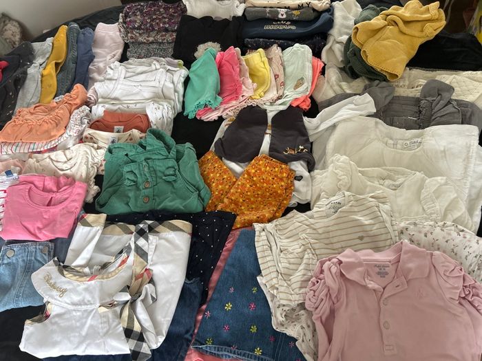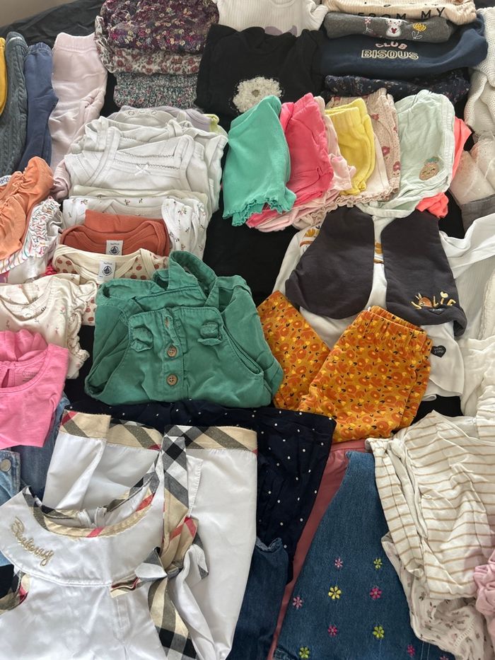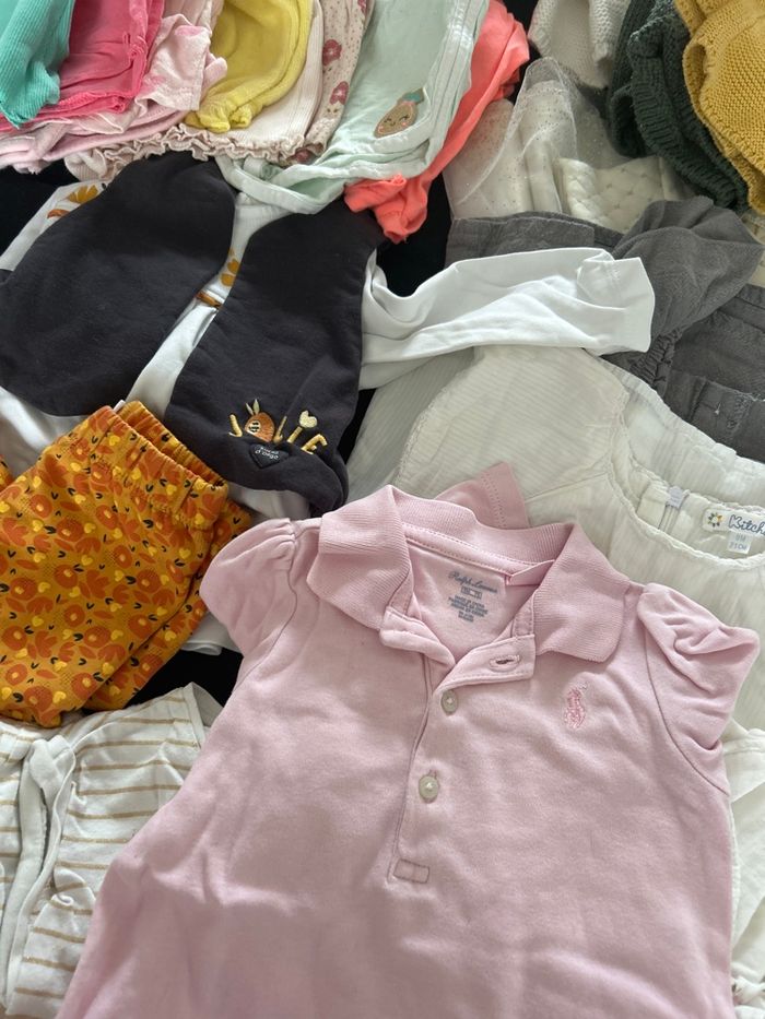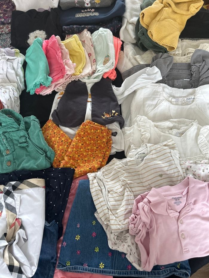 9 mois Hauts – 19 pièces • 13 tee-shirts manches courtes • 1 top à fines bretelles • 2 hauts manches longues • 3 blouses Sweats / Gilets – 6 pièces • 3 sweats • 3 gilets Bas – 20 pièces • 9 pantalons / bas • 10 shorts • 1 salopette Ensembles – 1 pièce • 1 ensemble (legging + haut manches longues + boléro) Pyjamas / Nuit – 5 pièces • 4 pyjamas • 1 bas de pyjama Robes – 14 pièces • 14 robes Bodies – 13 pièces • 13 bodies Total : 78 pièces ✅ Marque: Kiabi/ Tape à l’œil/ Ralph Lauren/ Petit bateau/ Gemo/ Primark et autres!