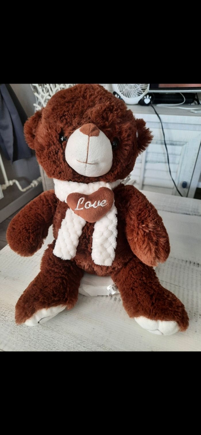 Très mignon ourson en peluche marron avec son echarpe et son cœur Hauteur 40 cm Neuf, jamais servis * Prix non négociable