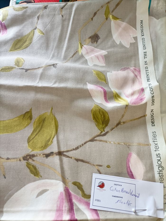 Coupon de tissu d'ameublement– qualité premium motif magnolias Tissu de marque Prestigious Textiles Company 100% coton 150x165 cm Belle densité, impression nette, excellente tenue. Maison non-fumeur. Présence de chats — tissus stockés en bacs fermés. Envoi soigné. Possibilité de lots.