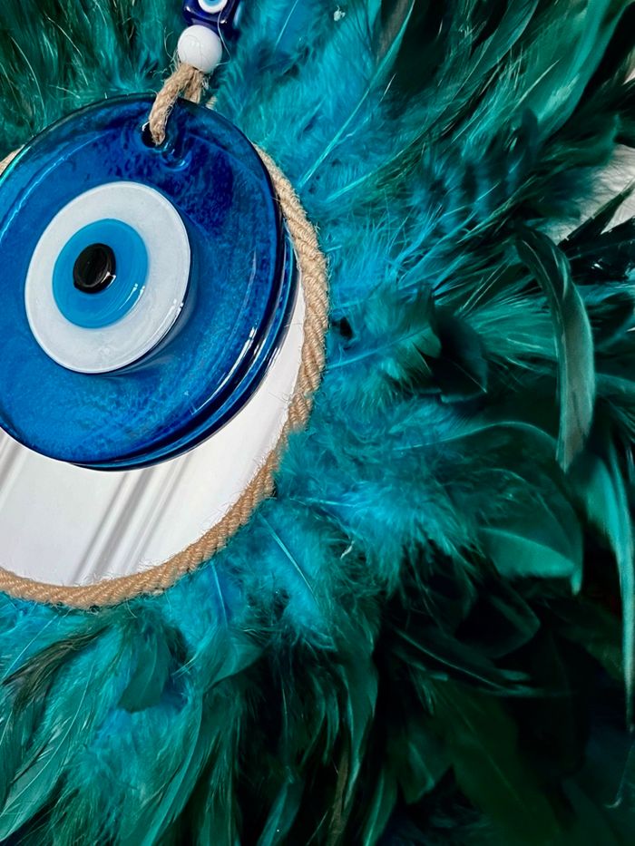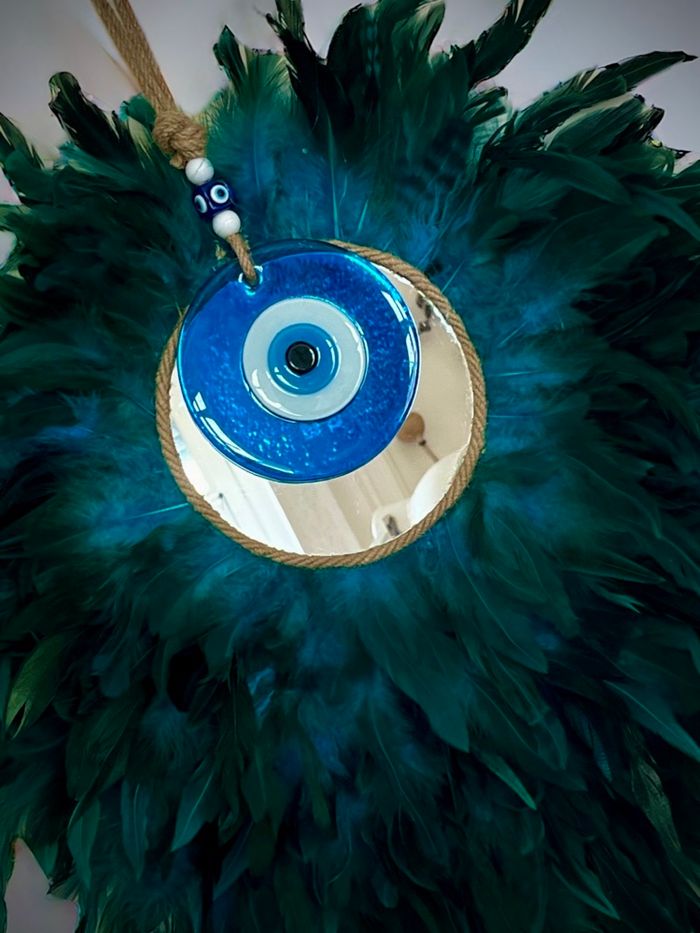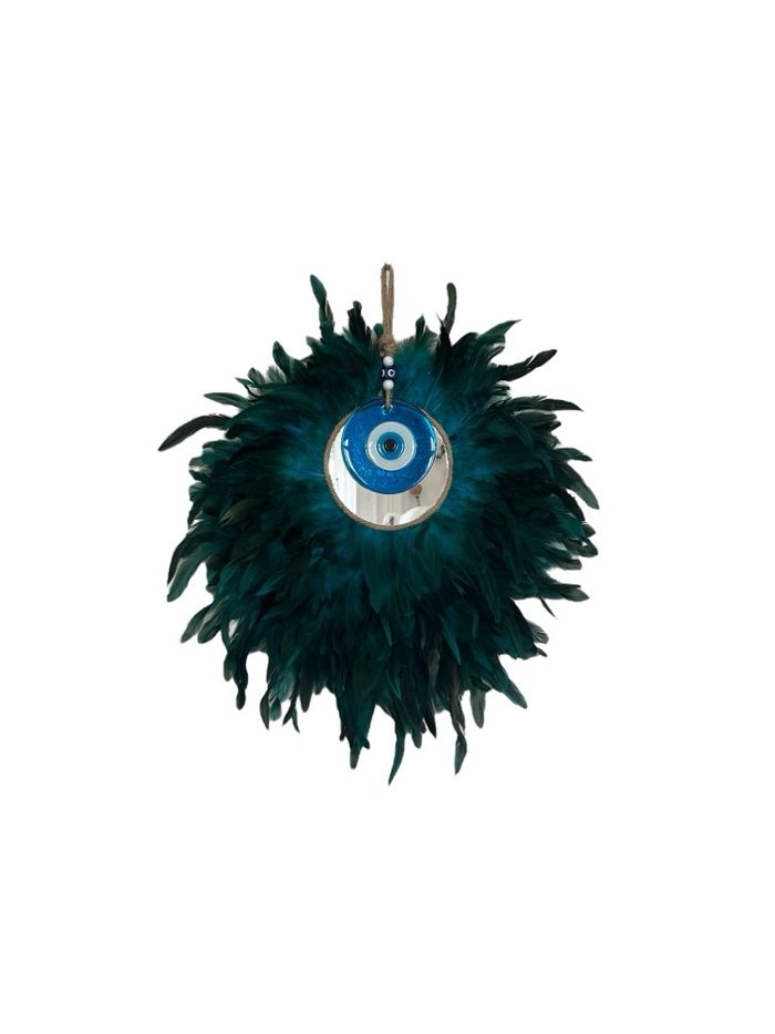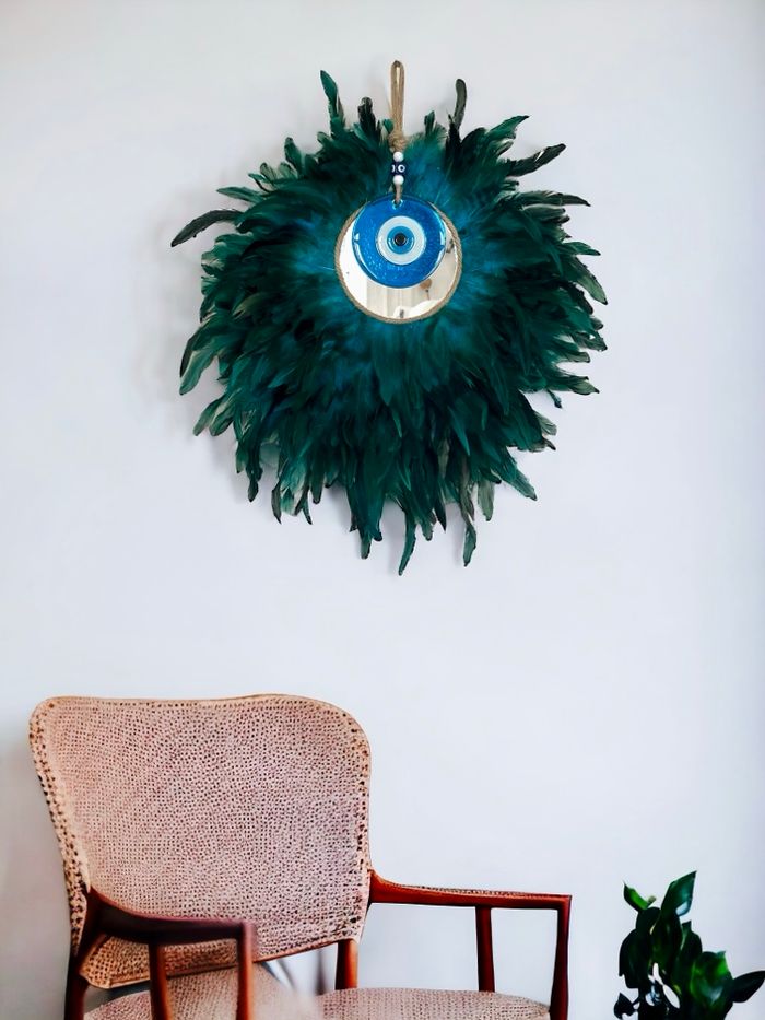 Le juju-hat Kahil est une décoration murale artisanale réalisée entièrement à la main. Composé de plumes naturelles de queue de coq aux nuances bleu canard et turquoise, il est monté sur un support en bois et orné d’un miroir central qui capte la lumière et attire le regard. Une amulette en verre turquoise et blanc, des perles décoratives et une corde naturelle viennent compléter cette création, inspirée des univers bohèmes et ethniques. Kahil est une pièce forte et expressive, idéale pour habiller un mur de salon, de chambre ou d’entrée, et apporter une touche singulière et poétique à ton intérieur. Chaque création est unique, pensée comme un véritable bijou mural. Dimensions HT 50cm