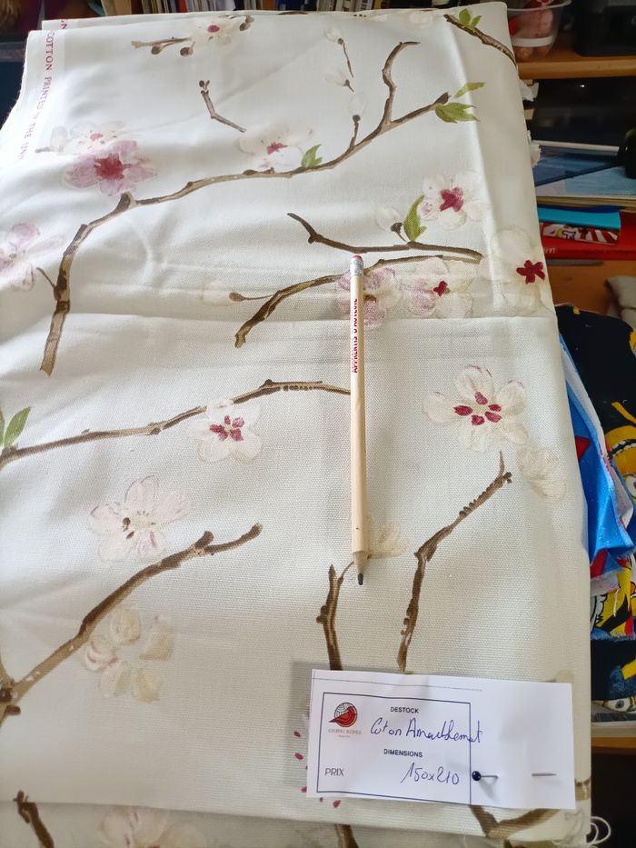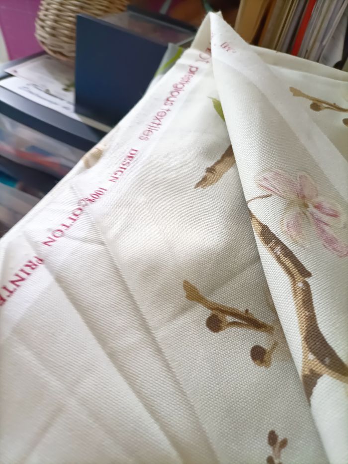 Coupon de tissu d'ameublement– qualité premium motif sakuras Tissu de marque Prestigious Textiles Company 100% coton 150x165 cm Idéal rideaux / coussins – grande largeur 165 cm – belle qualité ameublement Belle densité, impression nette, excellente tenue. Maison non-fumeur. Présence de chats — tissus stockés en bacs fermés. Envoi soigné. Possibilité de lots.