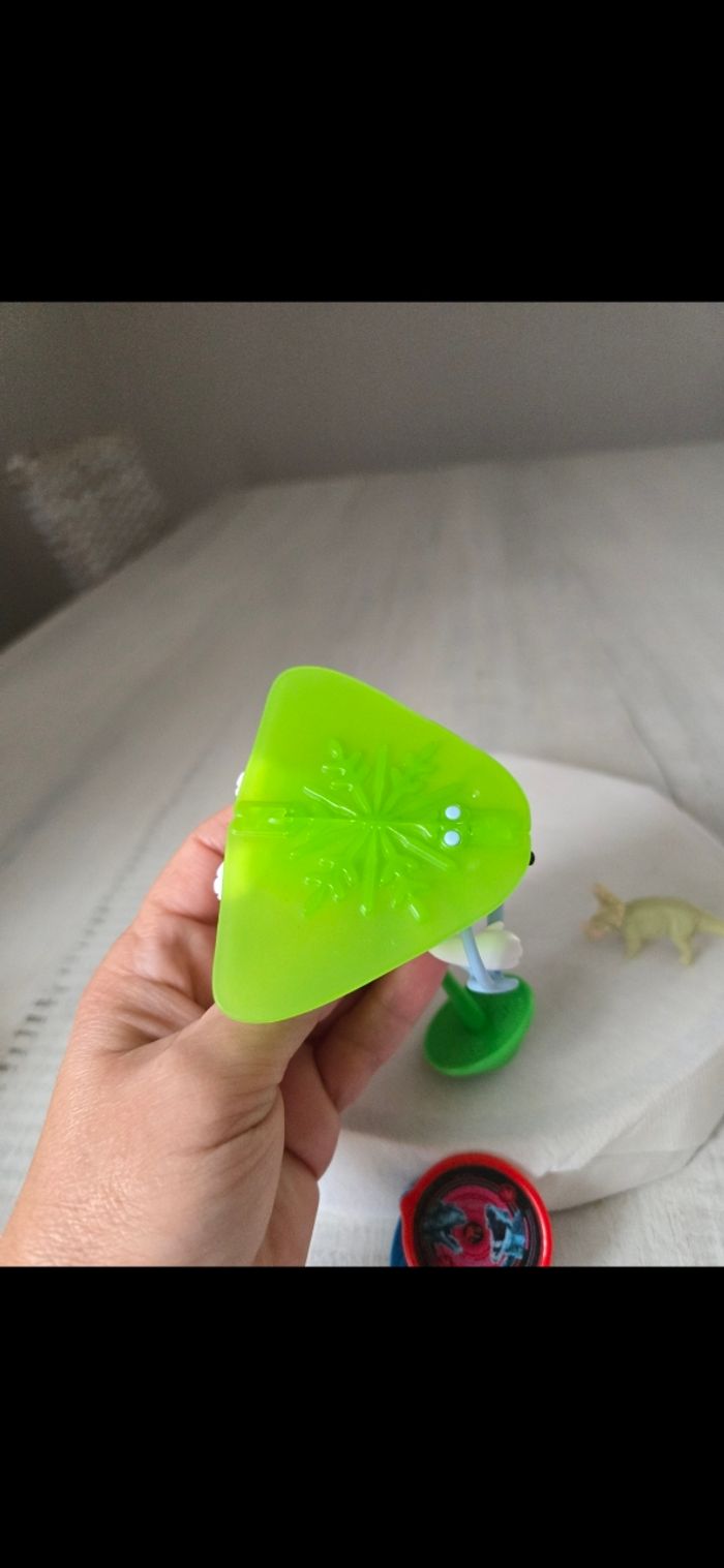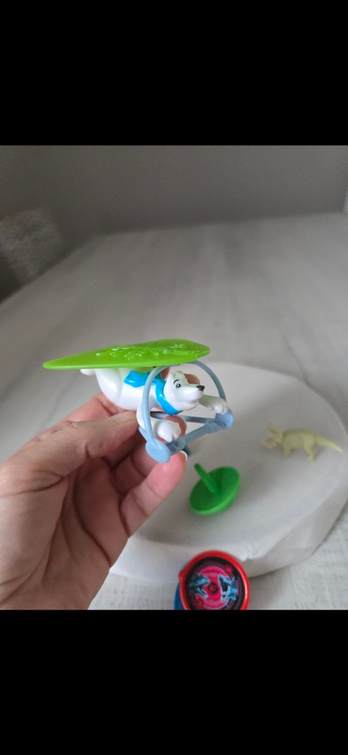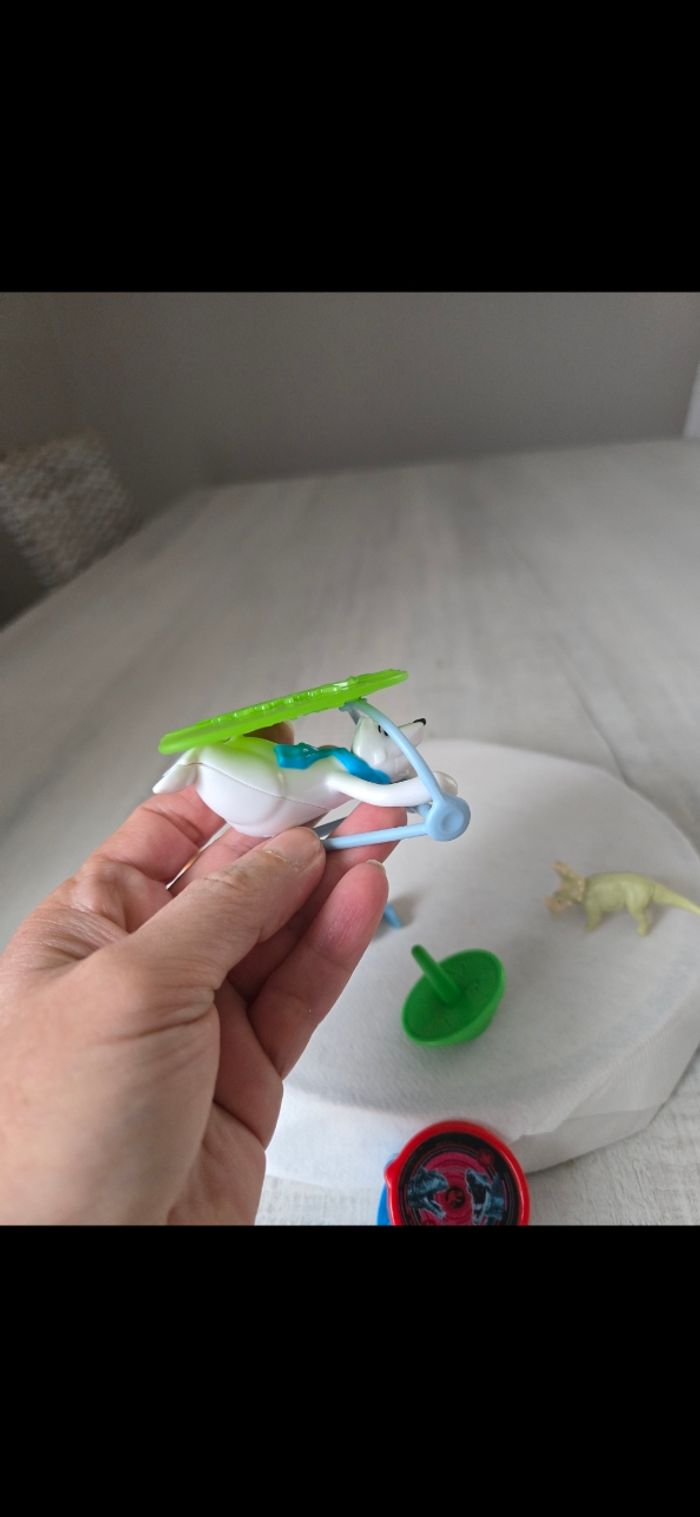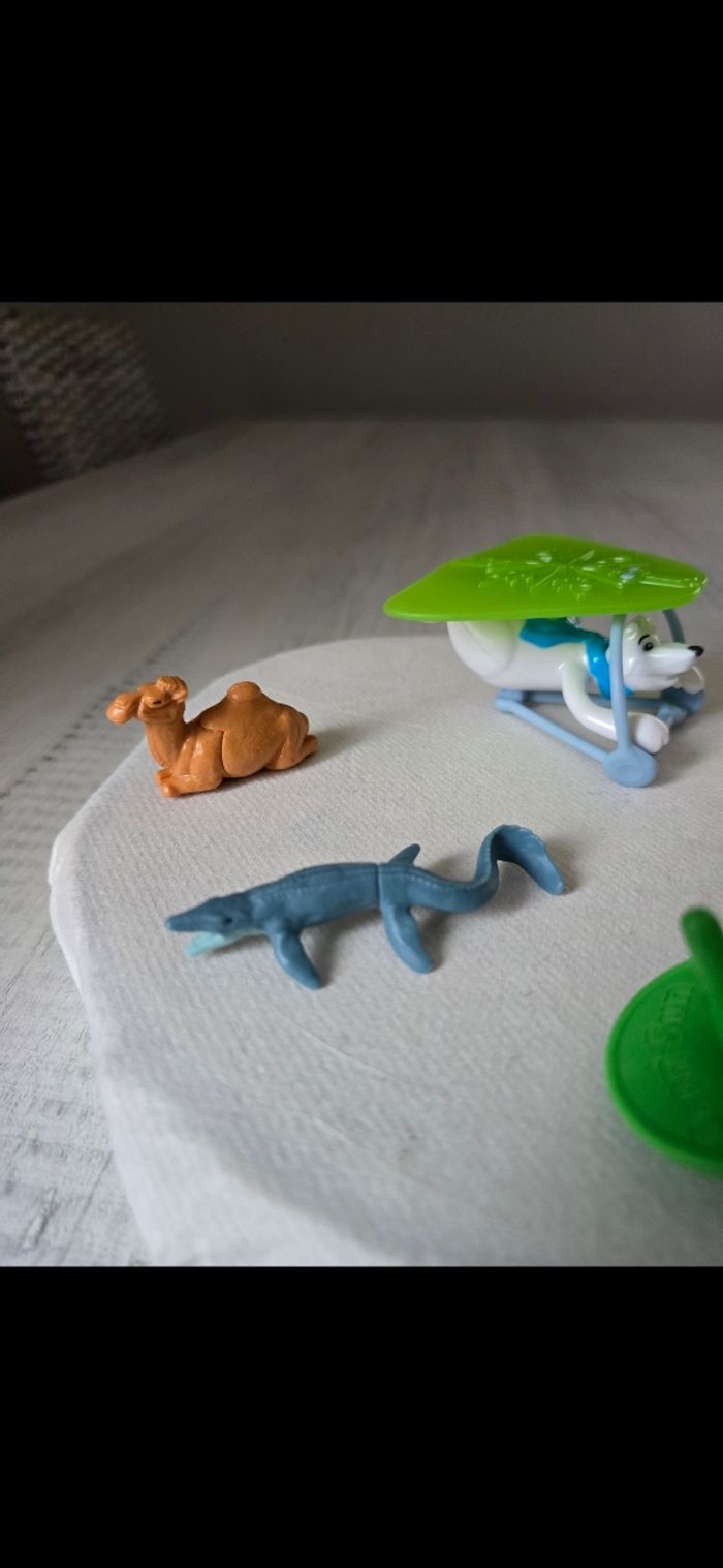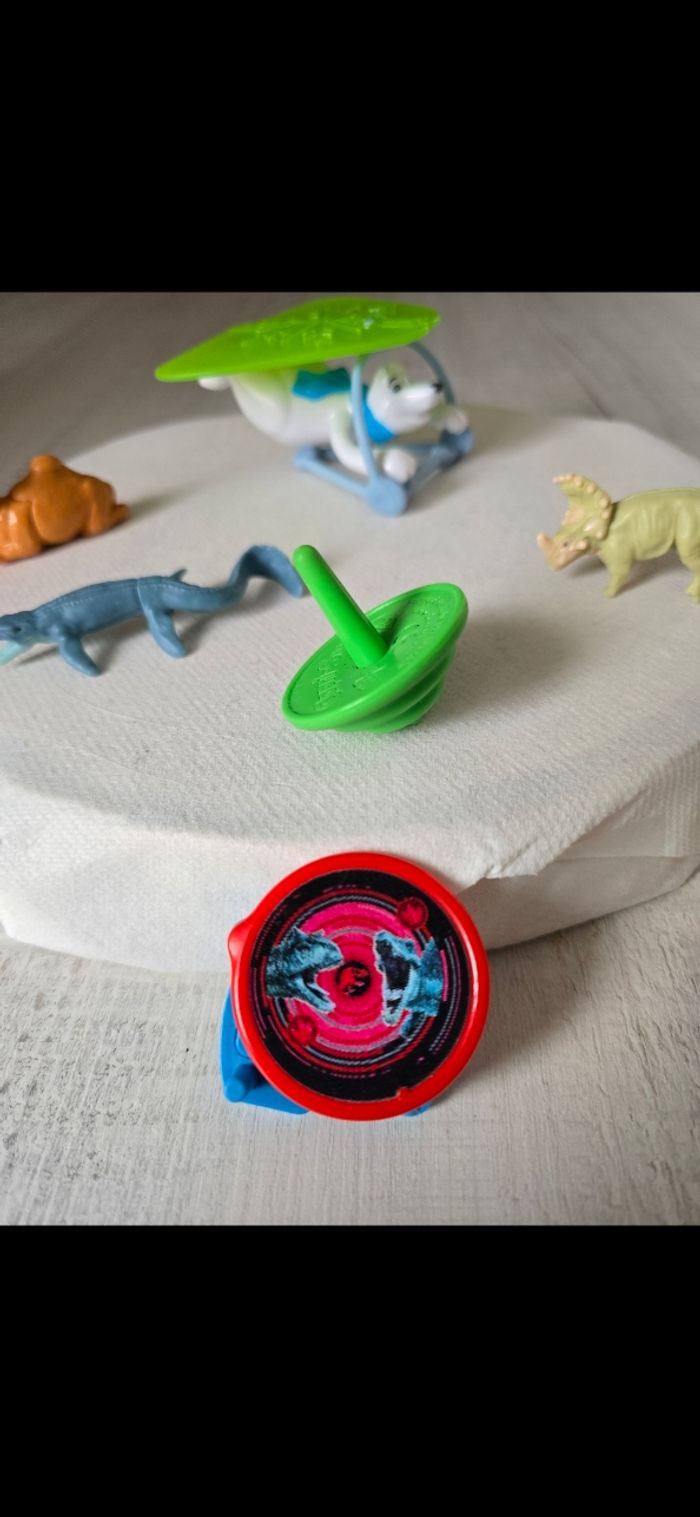 Lot figurines -1 figurine ours blanc avec deltaplane -2 figurines dinosaures - un rond qui change de couleur -1 dromadaire neuf - 1 toupie Neuves