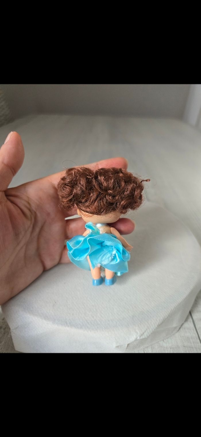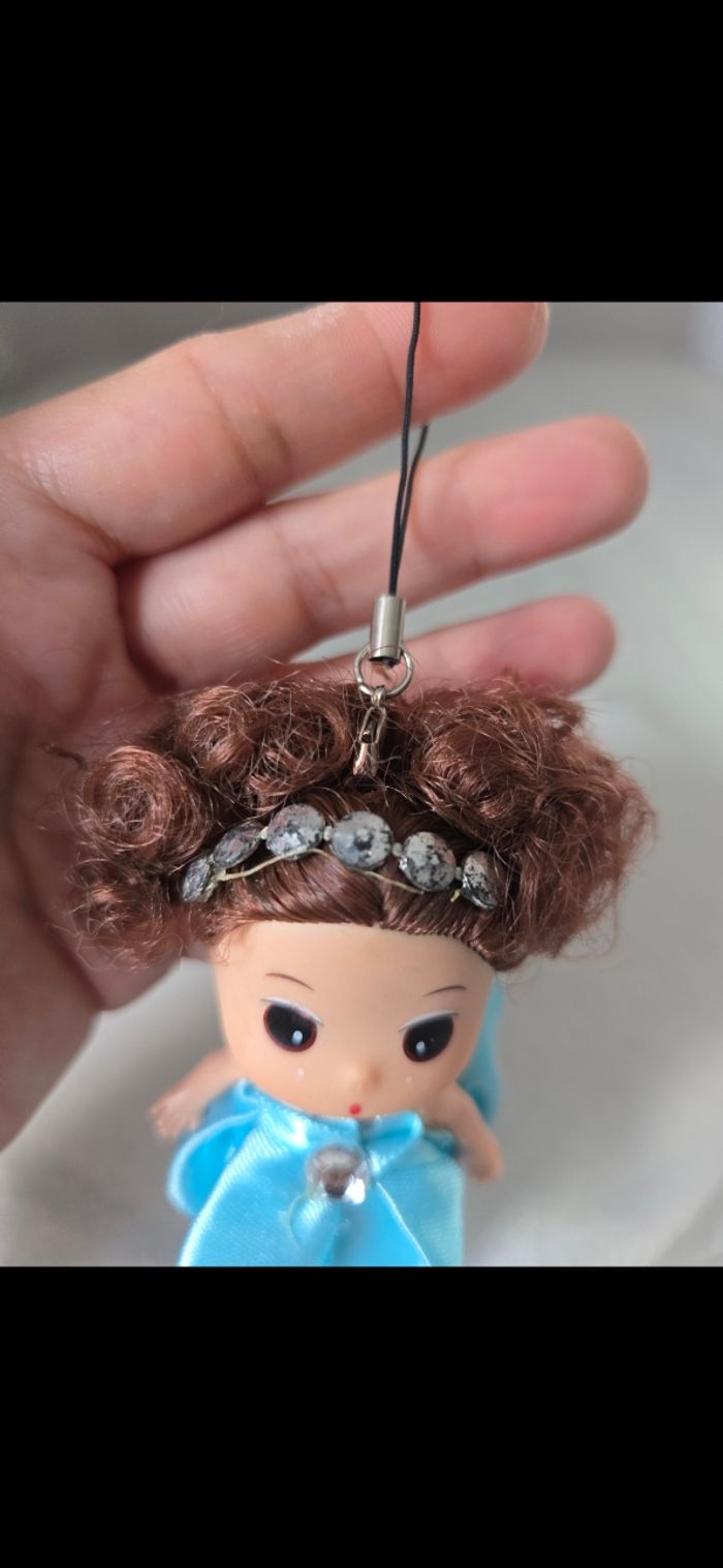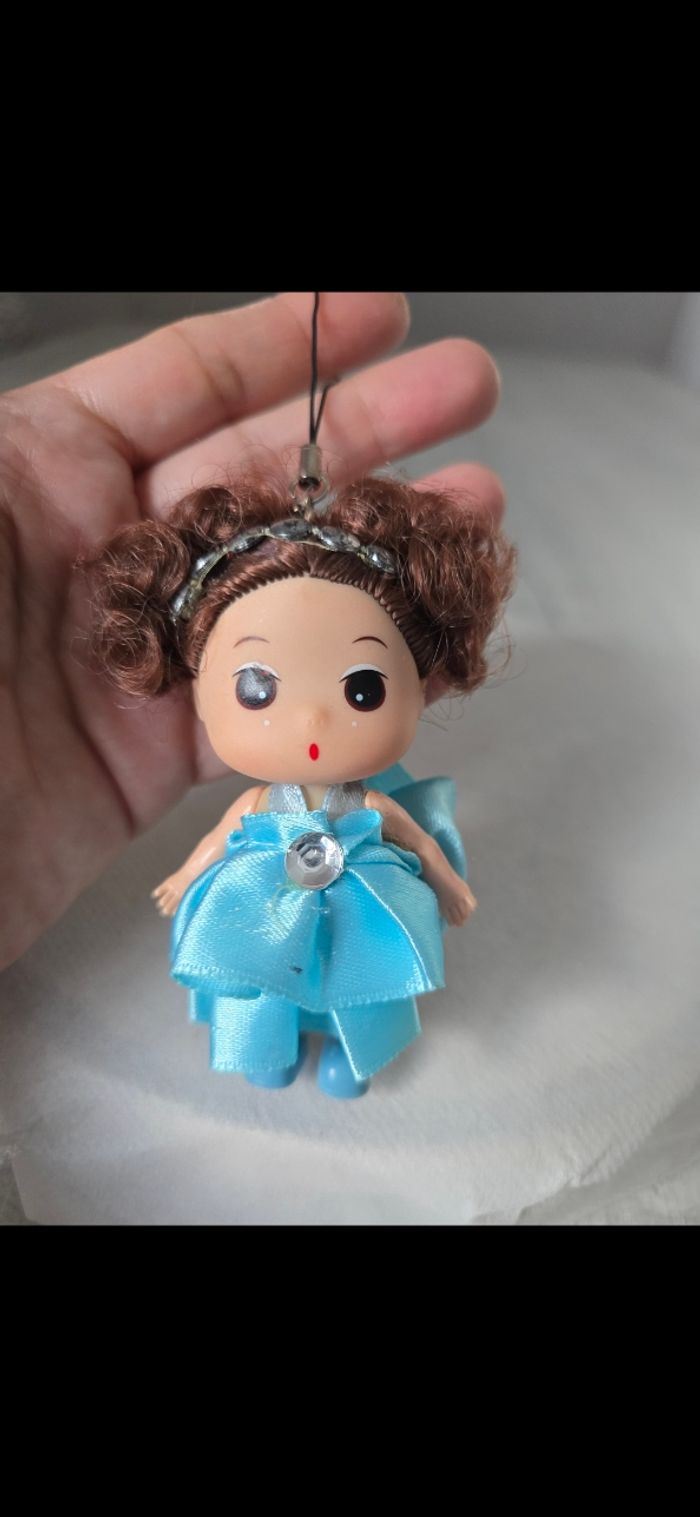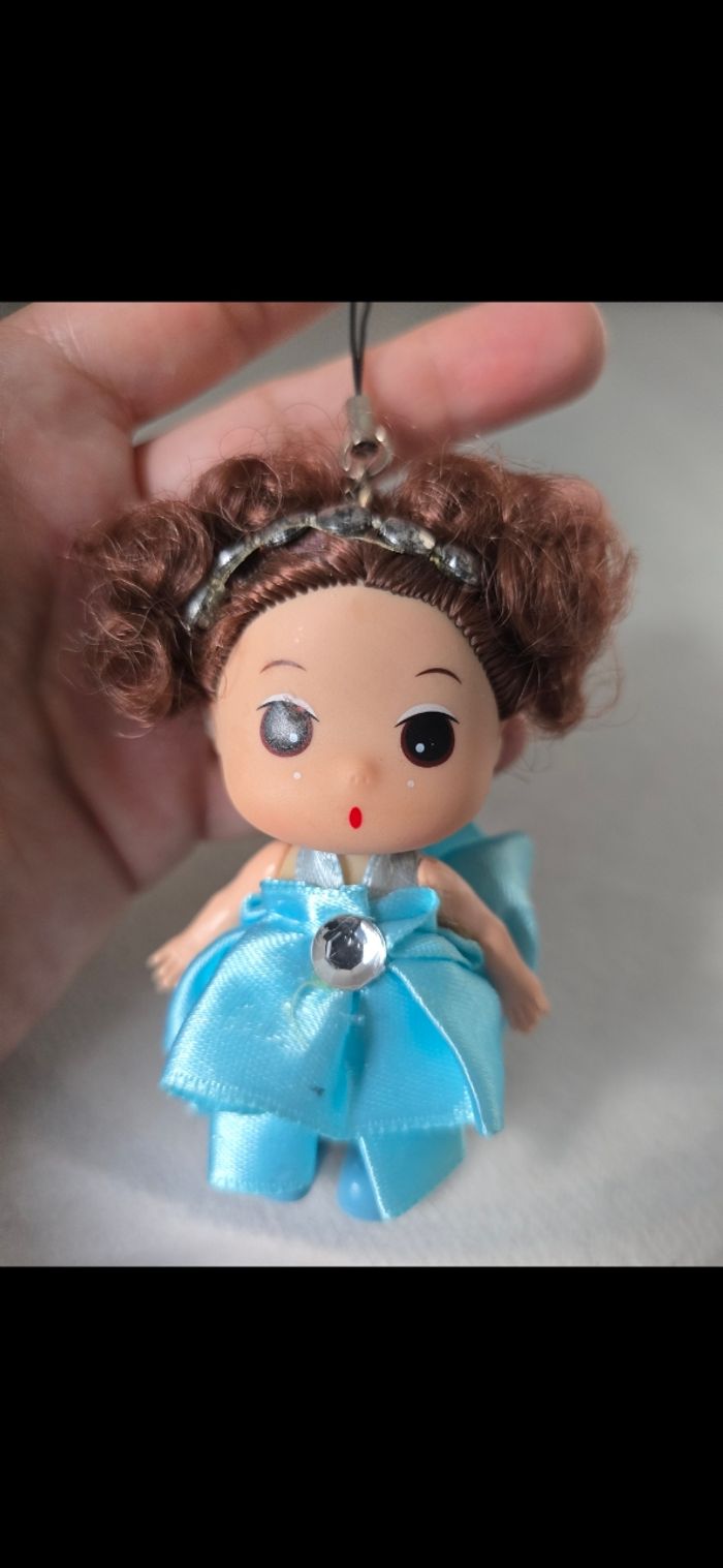 Mignonne petite poupée robe bleu Très bon état, juste sur le diadème l' argenté est un peu parti. Hauteur 9 cm Fil avec mousqueton sur la tête *Prix non négociable