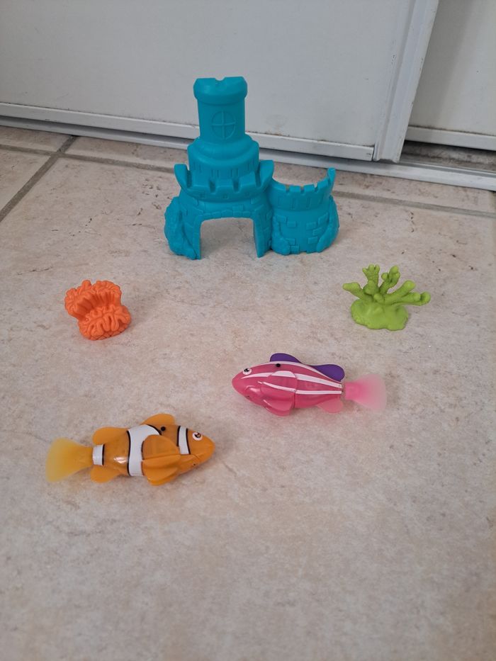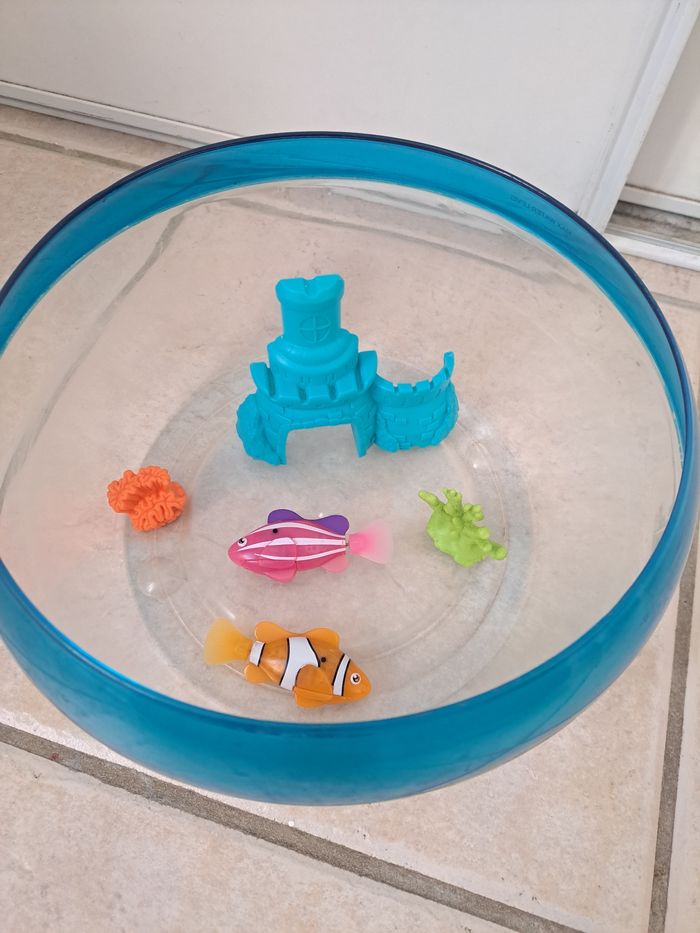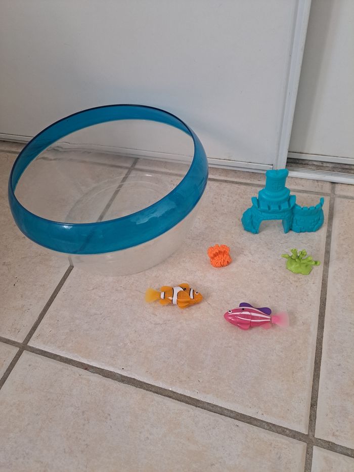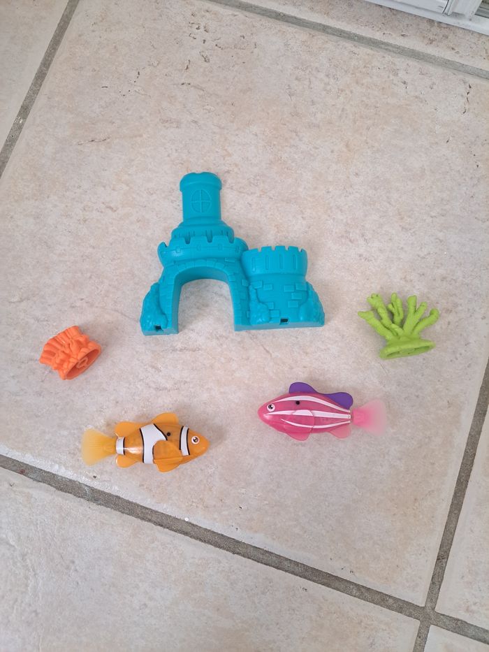 1 aquarium et 3 décorations d’aquarium avec 2 poissons robofish