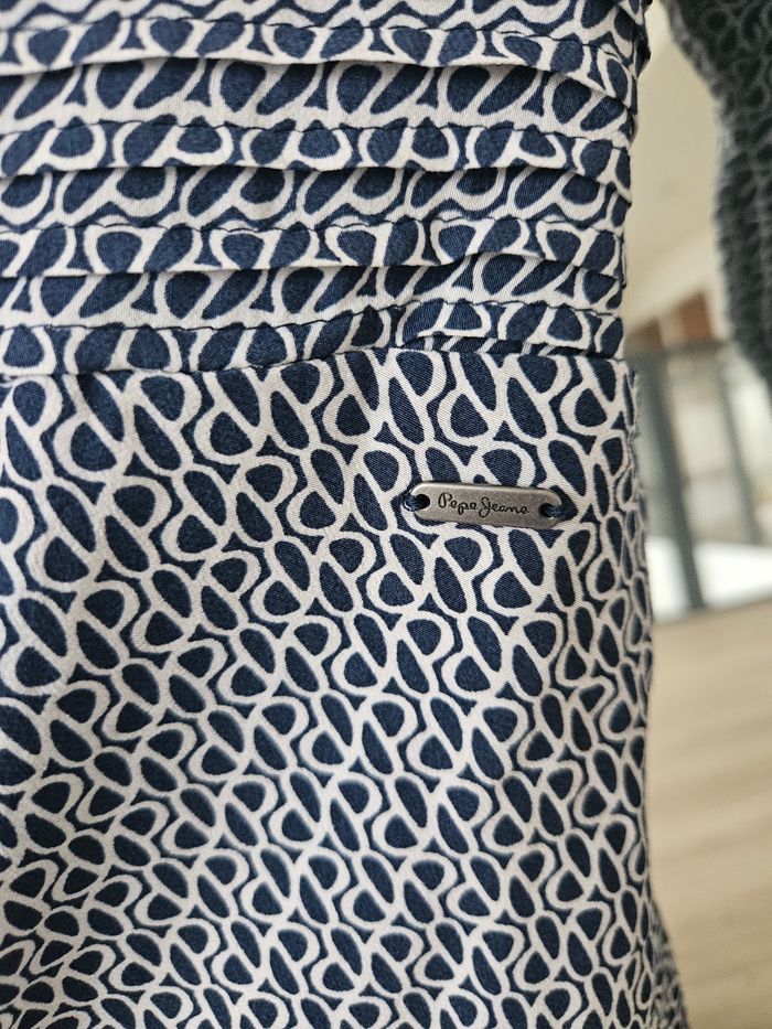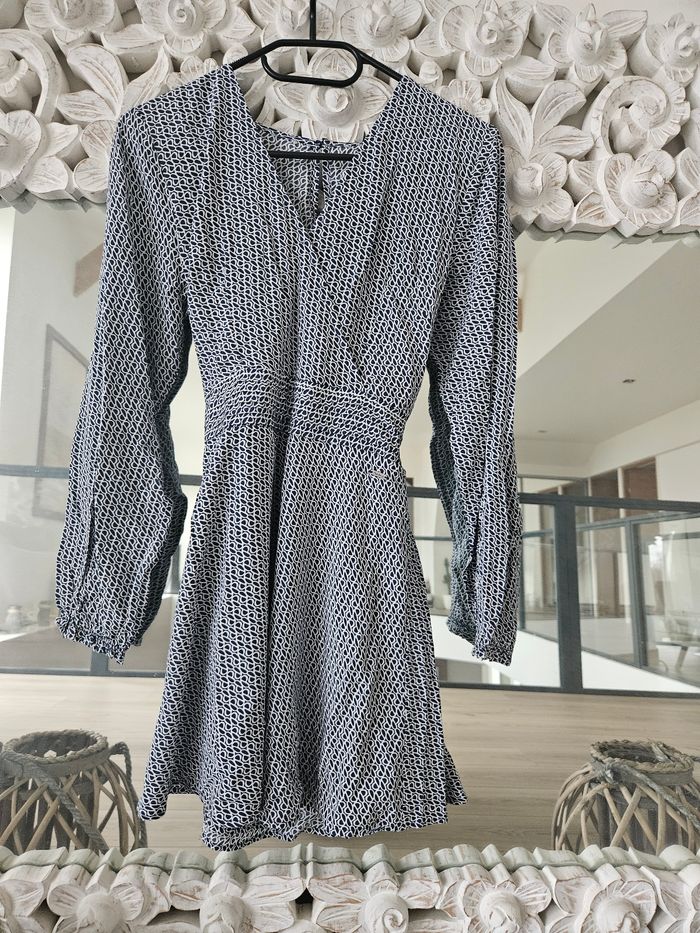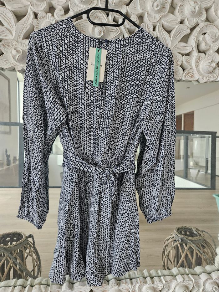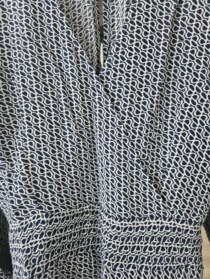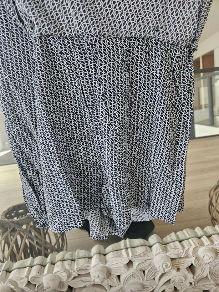 Cache cœur sur le devant. Short en dessous. Fermeture dans le dos avec un nœud. Marine et blanche.