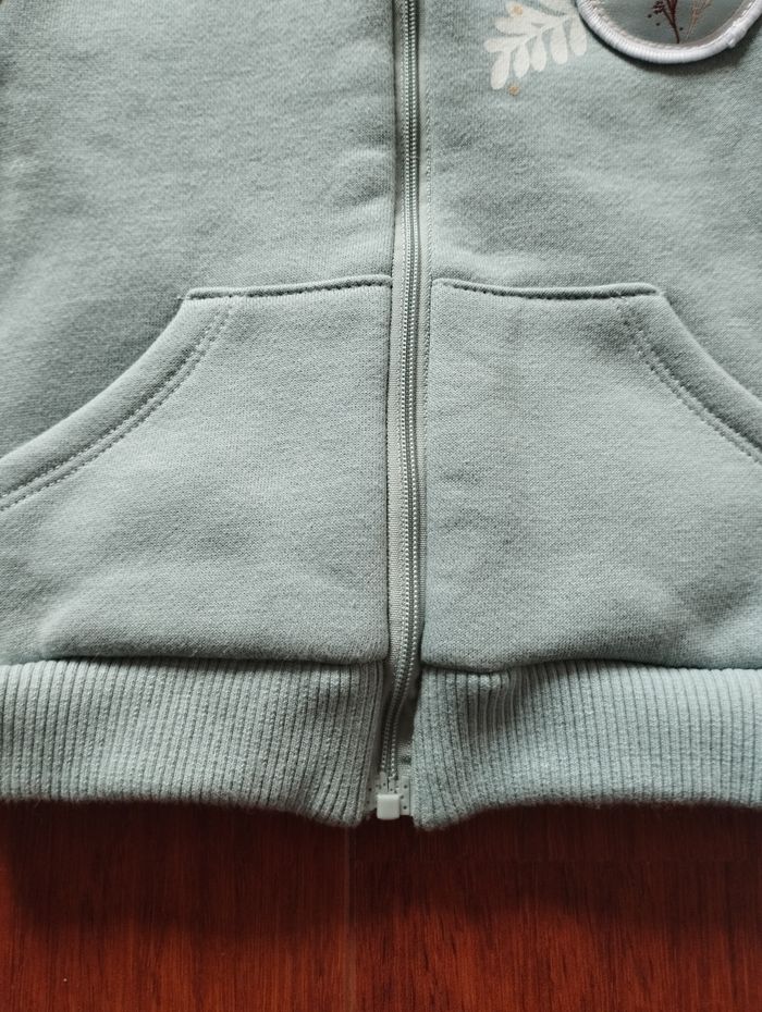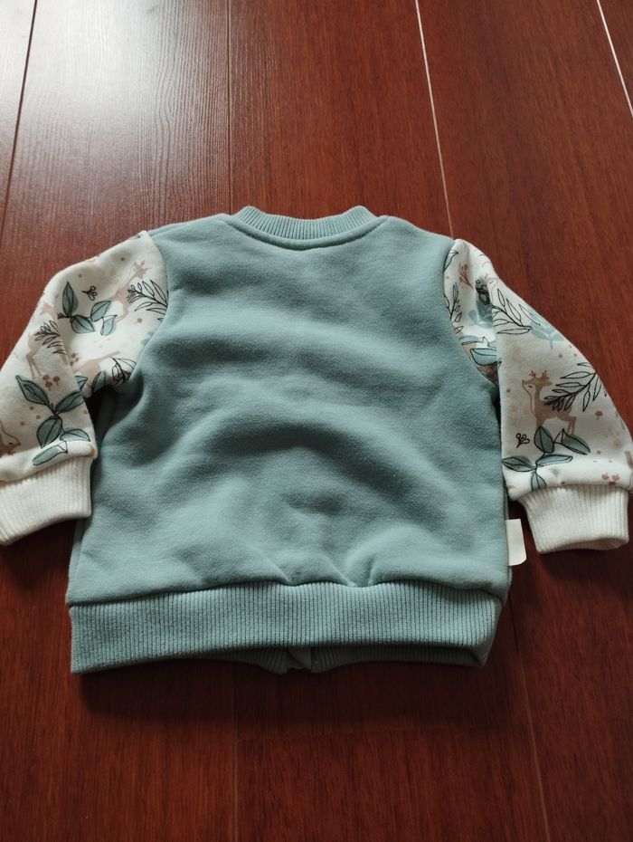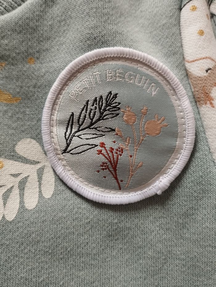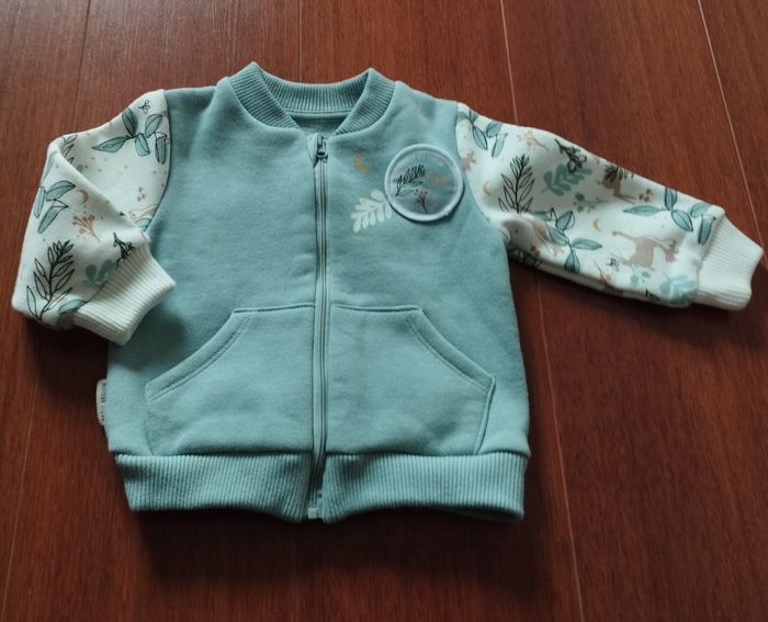 Sweat bébé fille de la marque Petit Béguin. C'est du 9 mois. Il est bleu ciel et blanc avec des motifs sur les manches. Il se ferme par une fermeture éclair. Il y a 2 poches sur le devant. Je n'ai pas d'infos sur la composition car l'étiquette a été découpée. Il est un peu délavé mais reste en bon état.