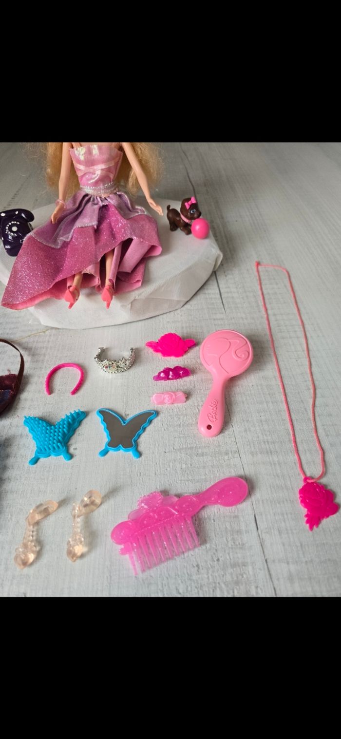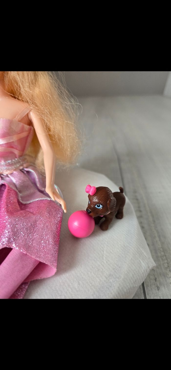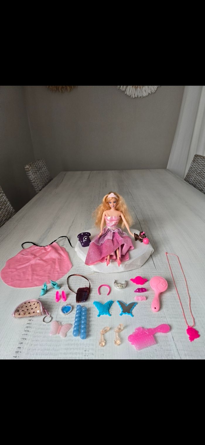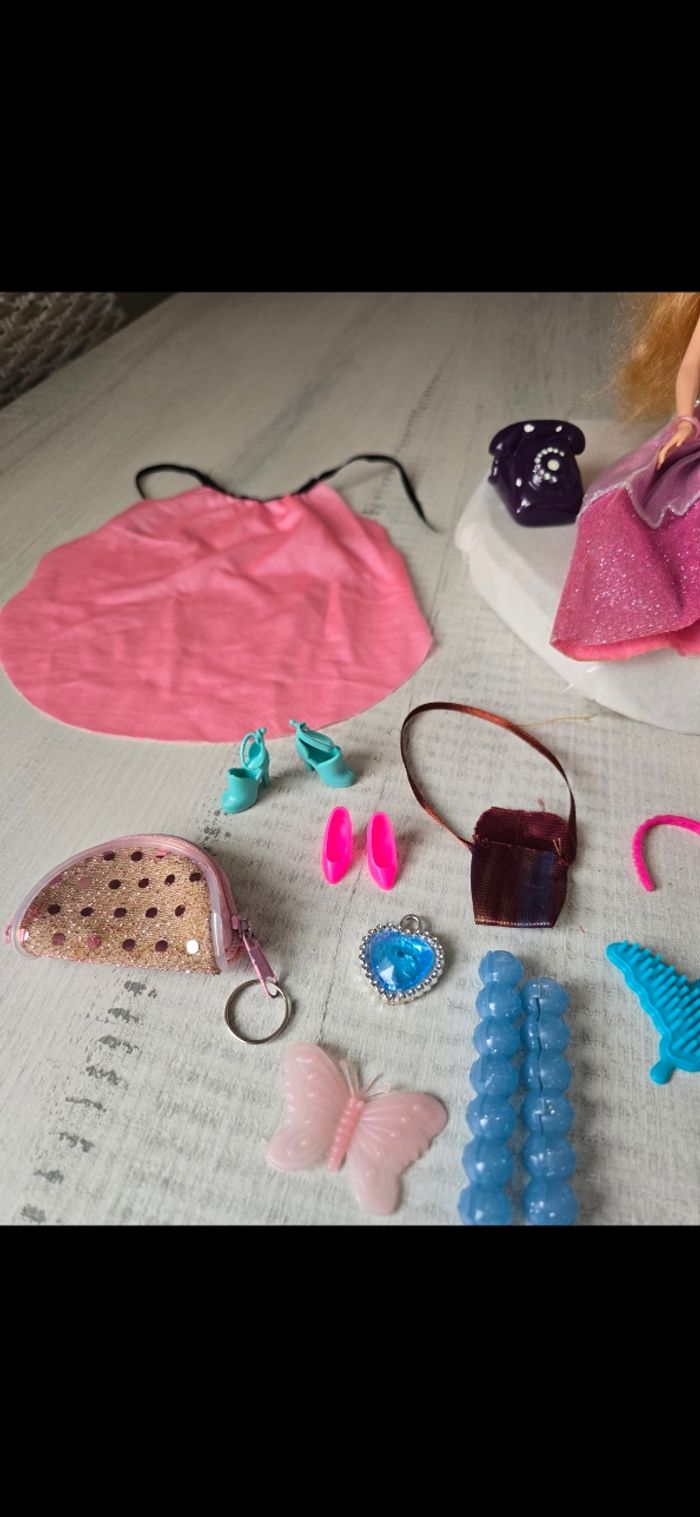 Poupée avec accessoires Collier/barettes/chaussures/cape rose/miroir et brosse papillon bleu/ téléphone Petit chien avec son ballon aimanté au museau Très bon état *Prix non négociable