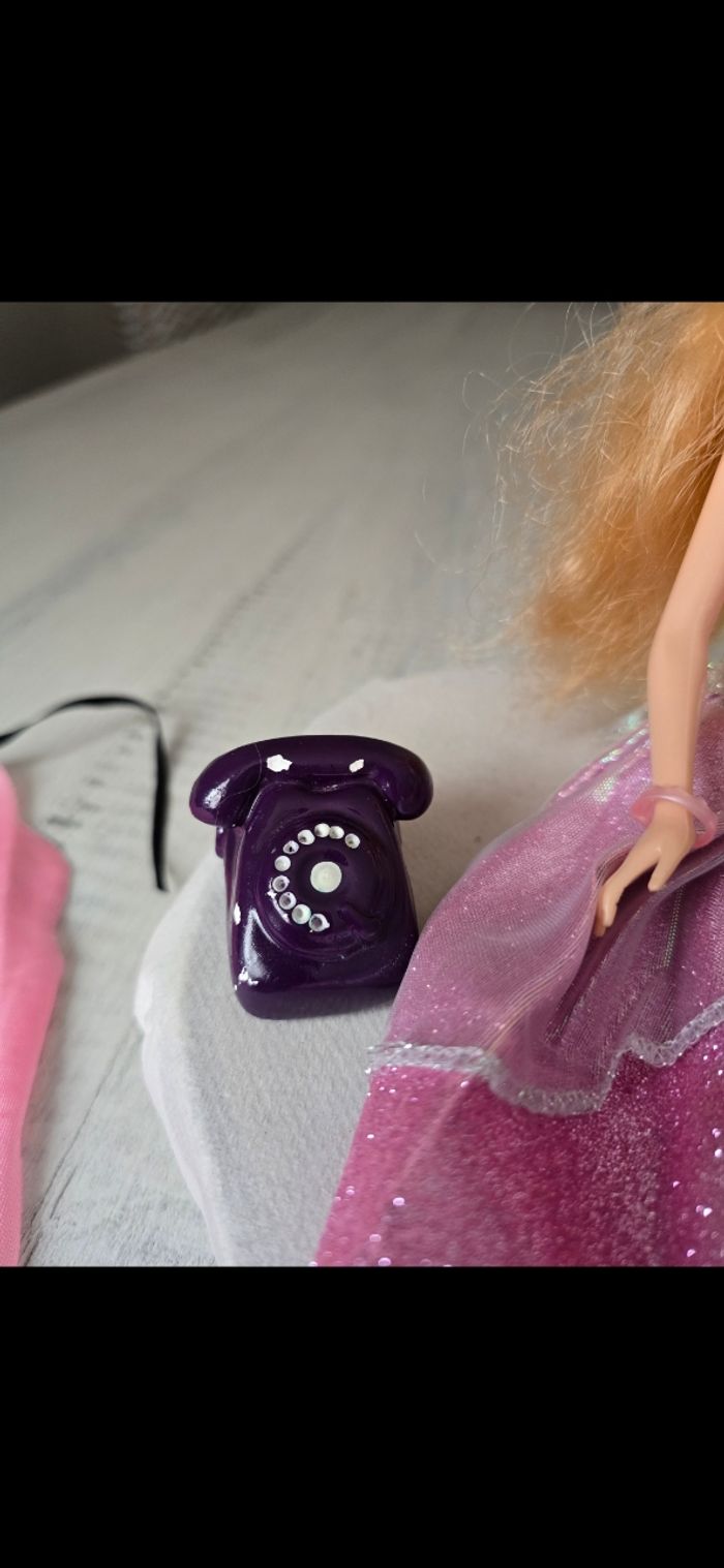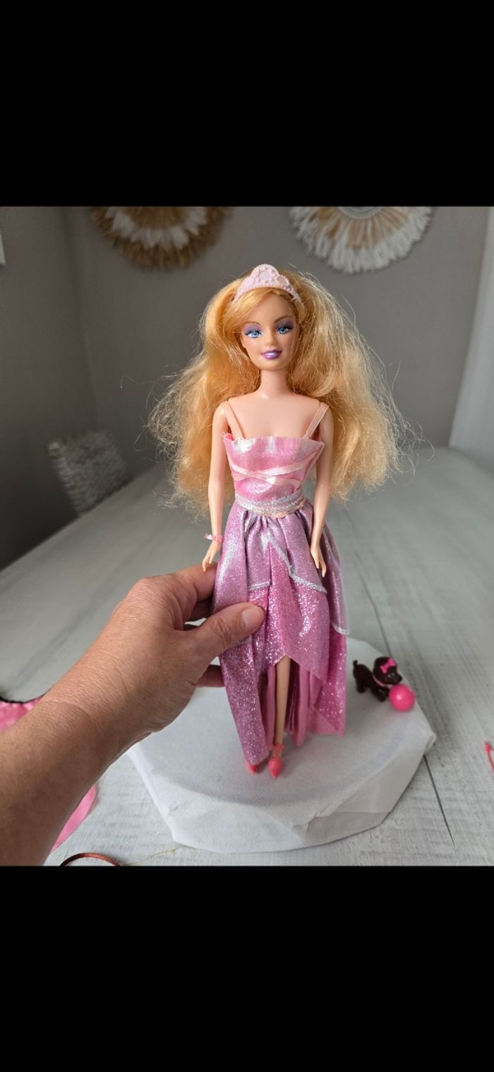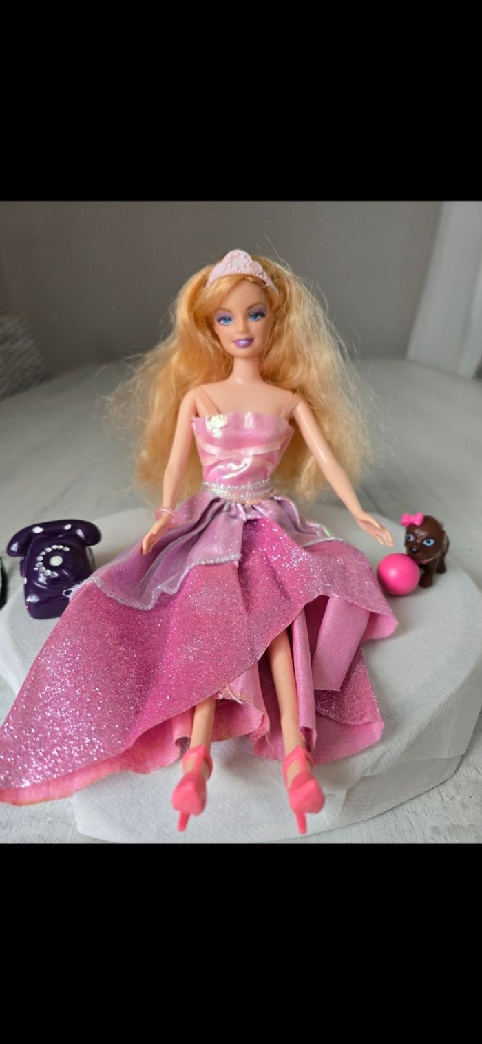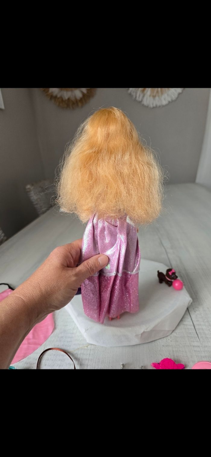 Poupée avec accessoires Collier/barettes/chaussures/cape rose/miroir et brosse papillon bleu/ téléphone Petit chien avec son ballon aimanté au museau Très bon état *Prix non négociable