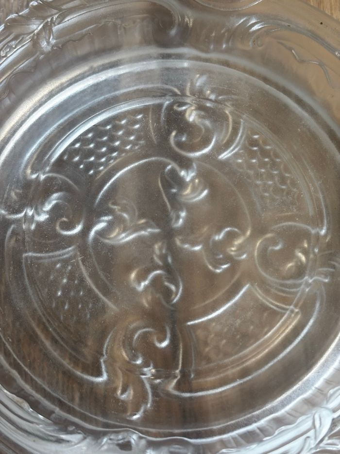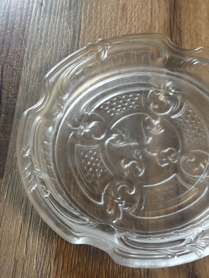 Ancien dessous de bouteille ou vide-poche en verre moulé pressé. Décor en relief avec motifs rocaille et volutes stylisées, bord chantourné élégant. Verre épais, belle qualité, style rétro / vintage. Peut servir de dessous de bouteille, vide-poche, petit plat décoratif ou coupelle d’appoint. Mis en état satisfaisant car présente un petit éclat entouré sur la photo (millimétrique et à peine visible), les autres photos zoomées montrent des rayures et non des fêlures. Reste en bon état général Diamètre approximatif : 14 cm