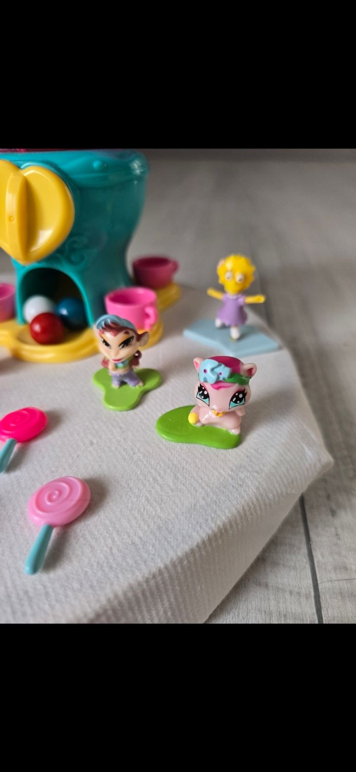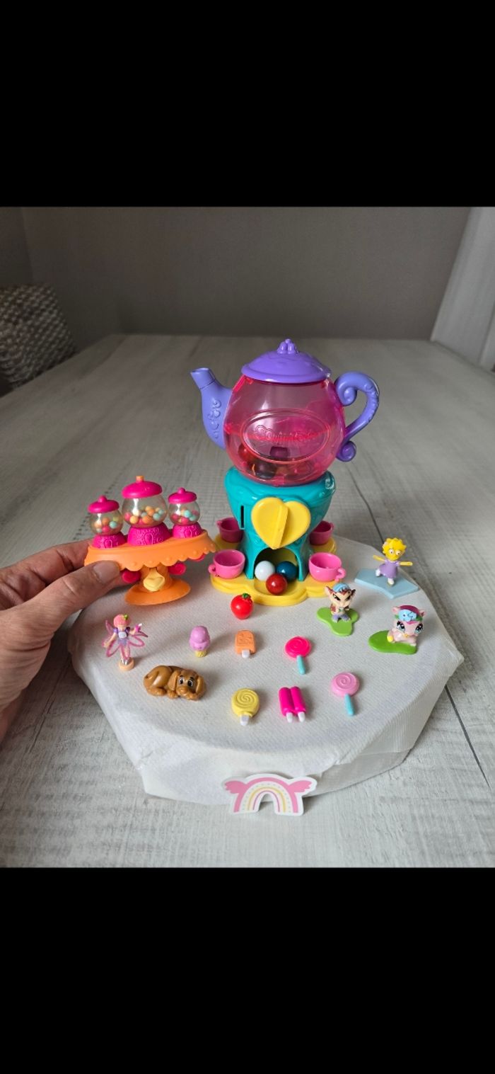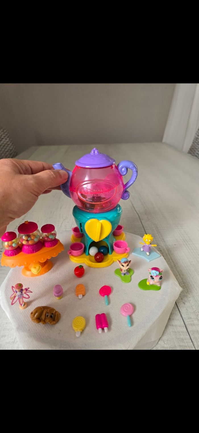Théière ou on tourne le bouton et des billes tombe , il faut appuyer sur le bouton vert avant de tourner le cœur Bar à bonbons Figurines neuves, le petit lapin qui est dans ma main avec les 2 autres a été oublié sur la photo globale mais fait parti du lot État neuf *Prix non négociable