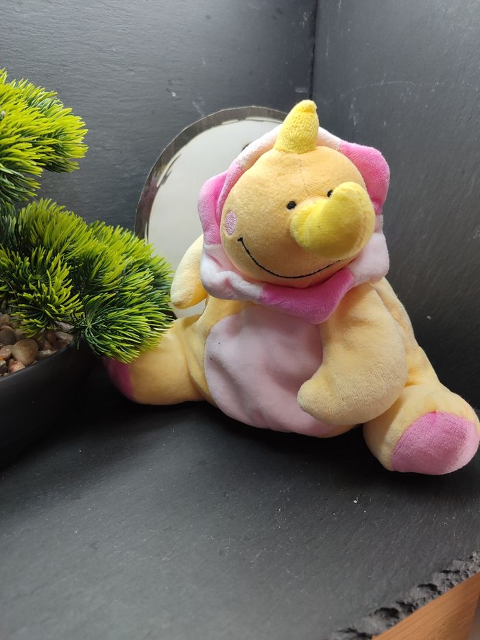 Doudou dinosaure tricératops rhinocéros peluche jaune rose pedro Ancien Boule