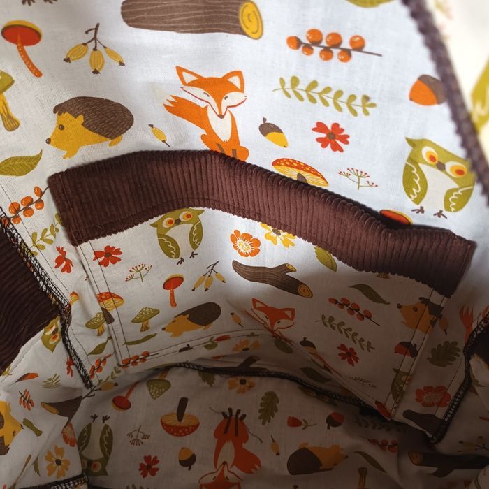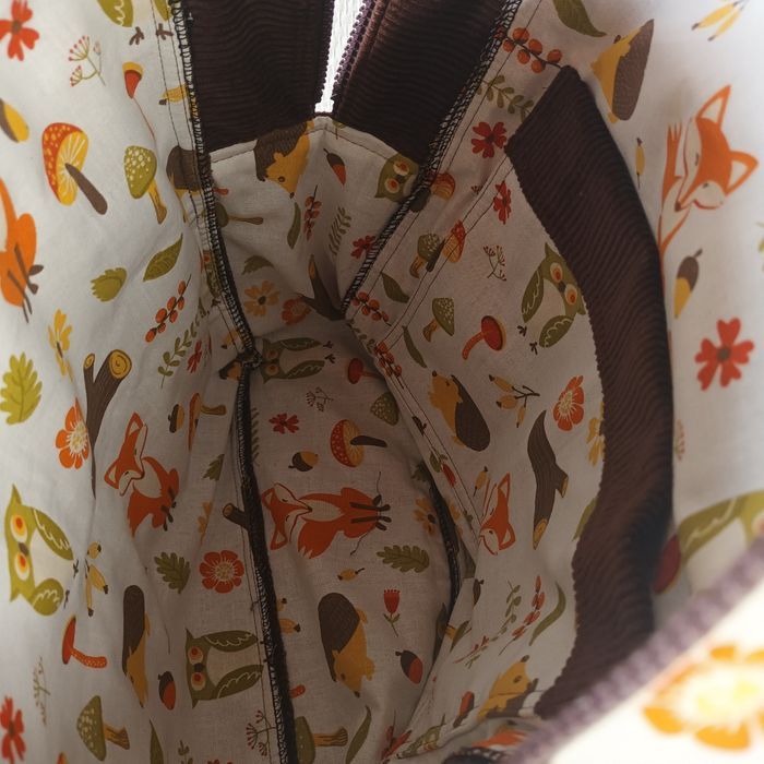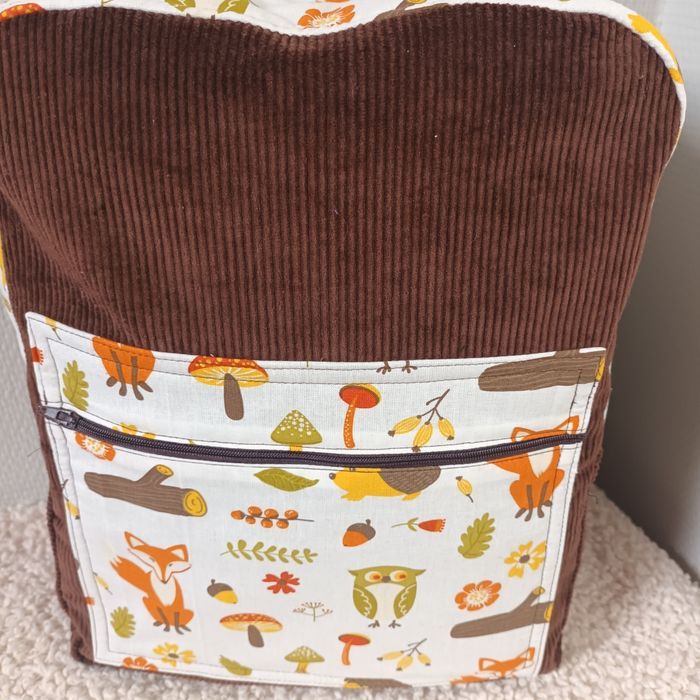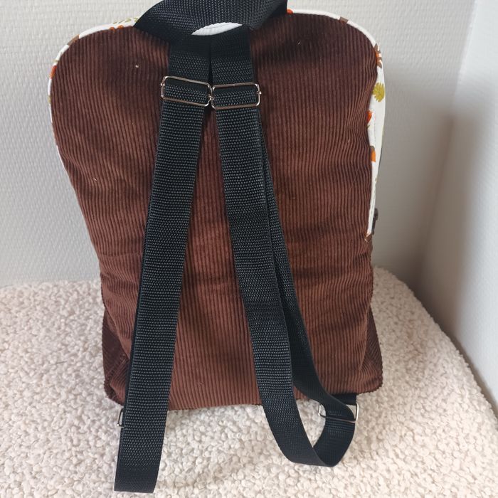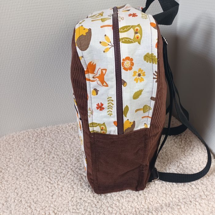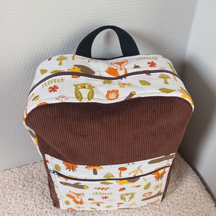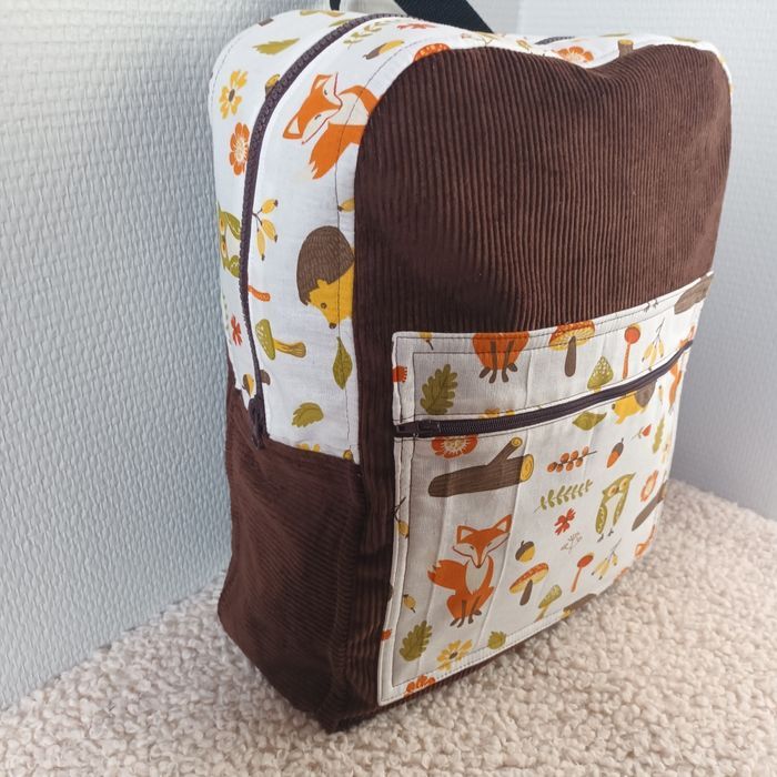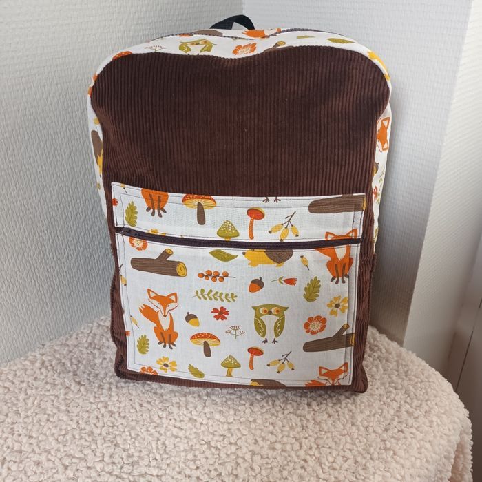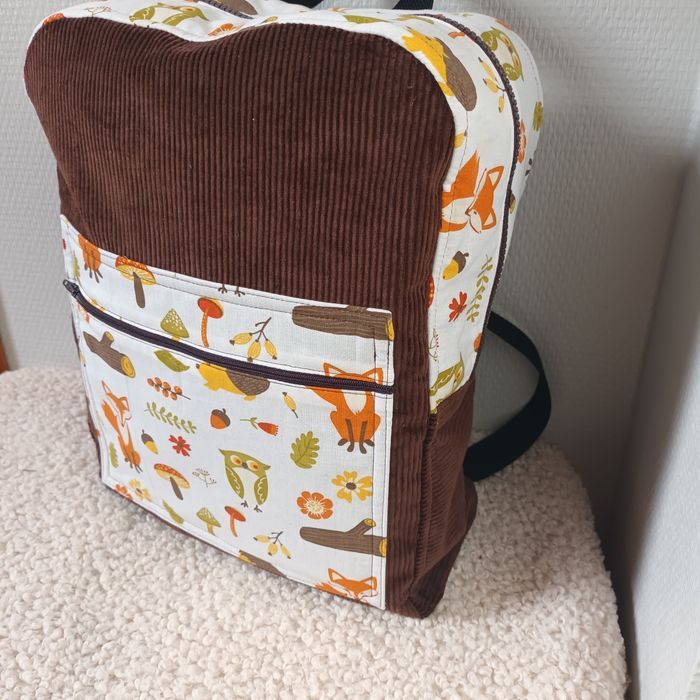 Velours marron chocolat et tissu coton thème renard. Hauteur 35cm, Longueur 26cm largeur 11cm. Poche extérieur zippée, poche intérieure, sangles au dos réglables et petite poignée pour porter le sac. Neuf fait 🙌