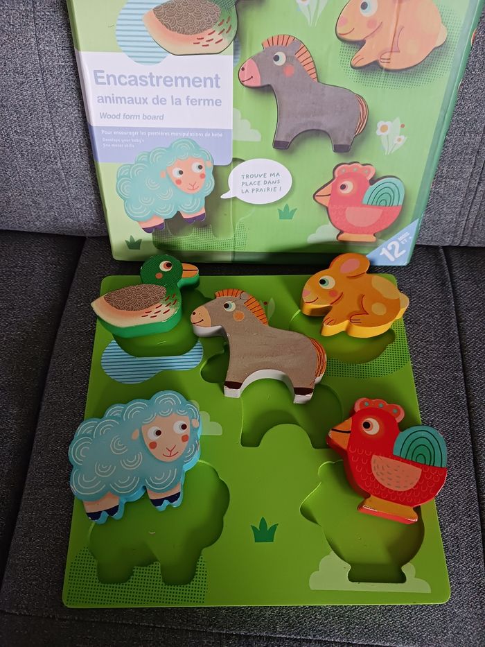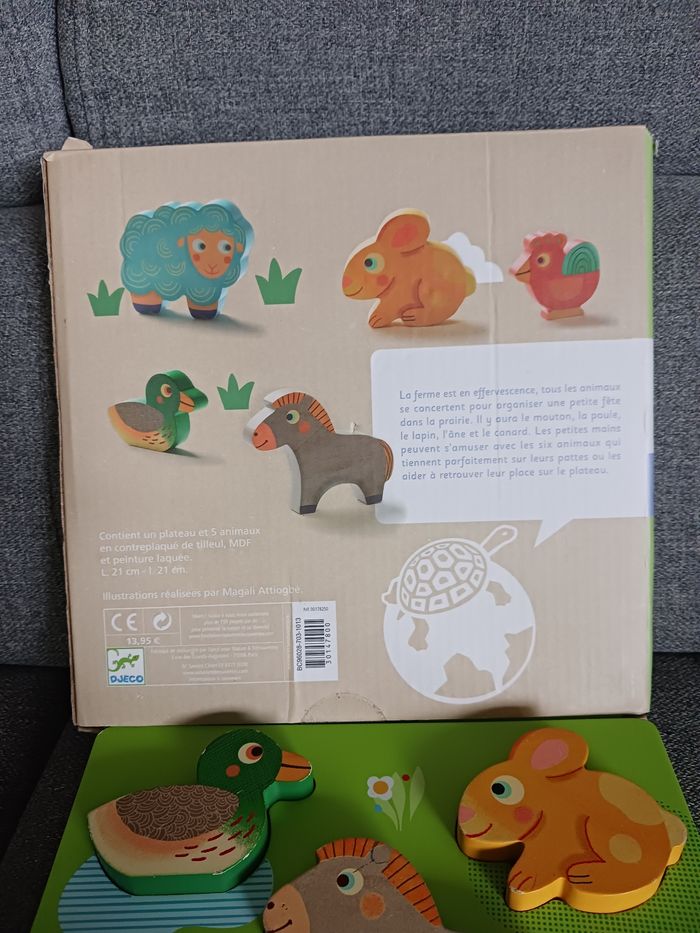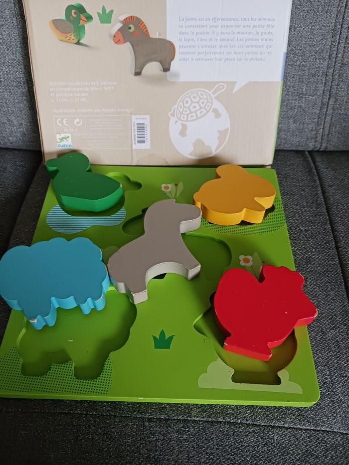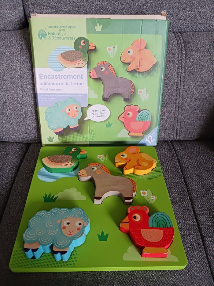 Puzzle encastrement Djeco pour Nature & découvertes Ideal pour apprendre la manipulation, les 5 petits animaux tiennent aussi debout. A partir de 1 an Petites marques du à une utilisation intense ( voir sur les 2 dernières photos)