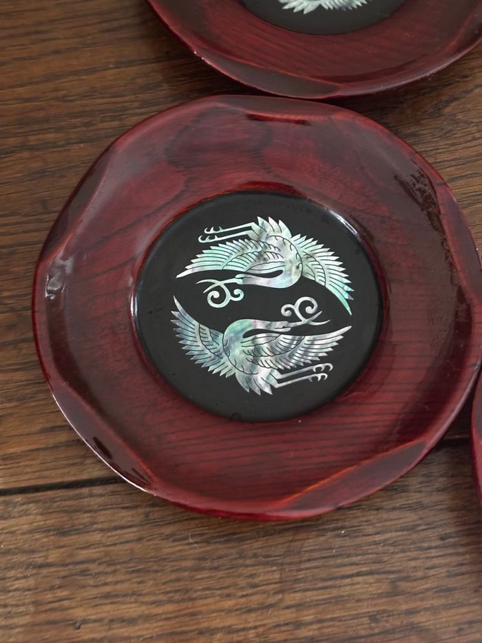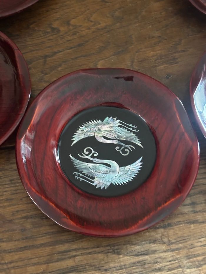 Ensemble de 6 sous verres ou coupelles asiatiques effet laqué décor grues - photo numéro 1