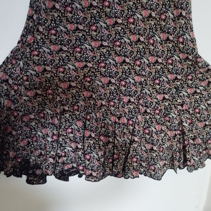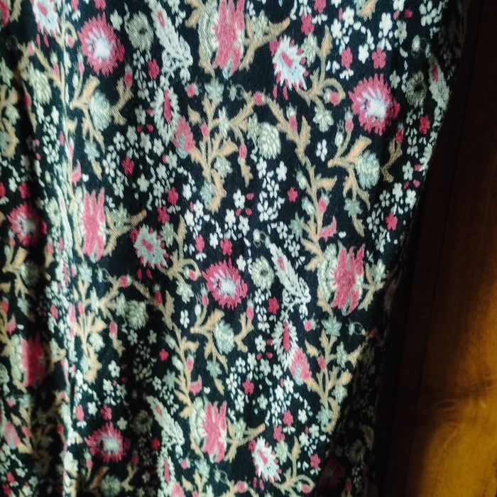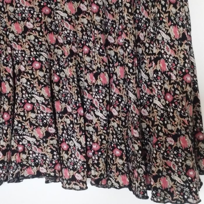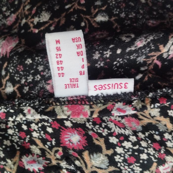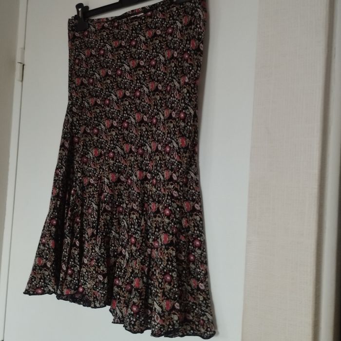 Jupe pour femme taille 44, des 3Suisses. Fluide, ample, plissée au bas de la jupe. Fond noir avec des couleurs Framboise, gris et beige. Taille élastiquée. Hauteur 65cm jusqu'en bas du genou. 100% Viscose
