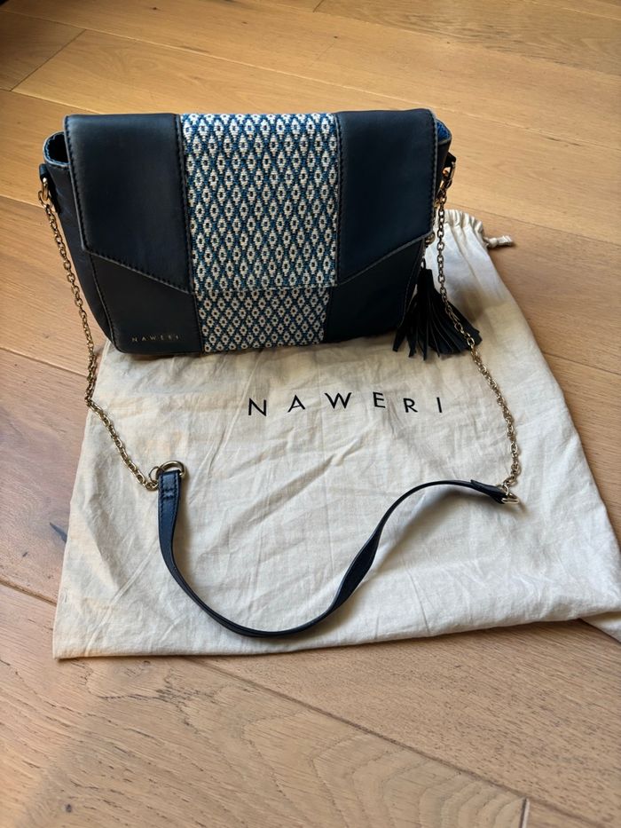 Sac bandoulière bi-matière effet cuir et tissu, couleur bleu. Détail pompon. En bon état cf photos. Marque Naweri