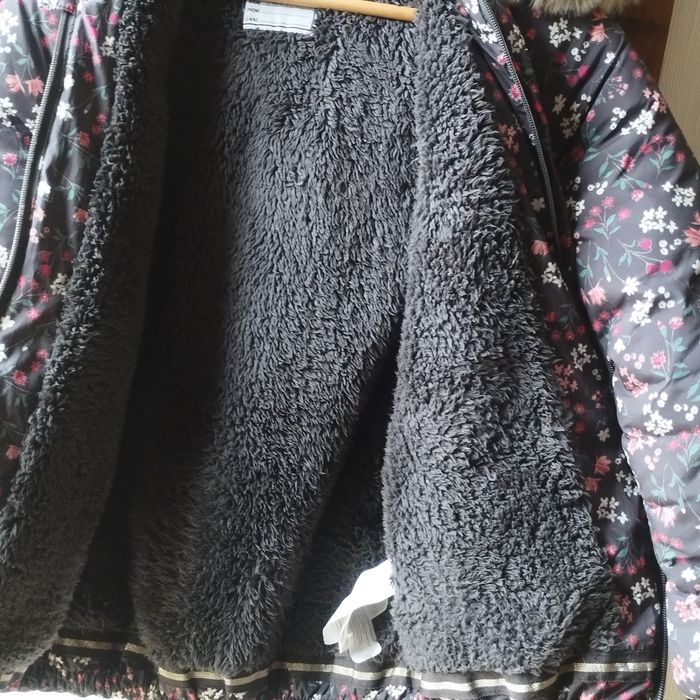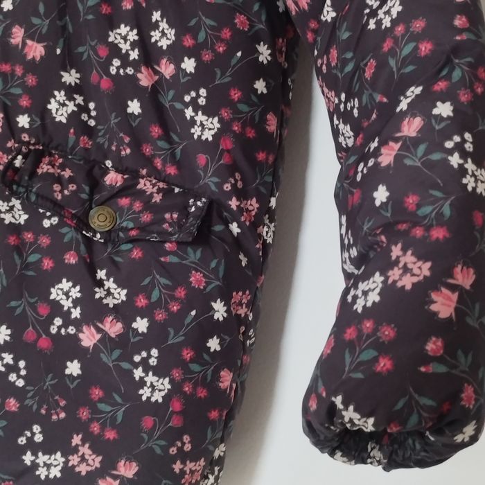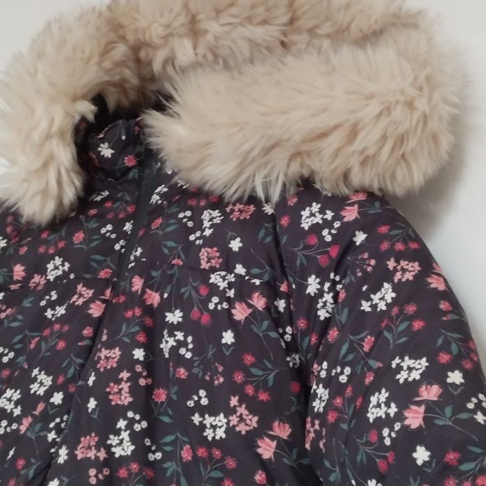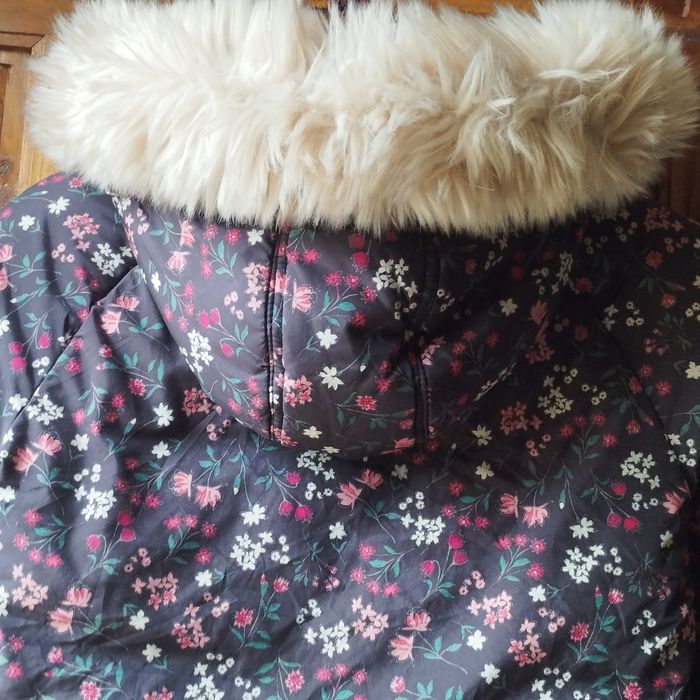 Très beau Manteau-doudoune à capuche fourrée et très belle fourrure démontable par boutons pressions. Fausse fourrure intérieur. 2 poches avec 1 bouton pression. Longue fermeture éclair remontant jusqu'en haut du cou, pate de protection en haut du col. Comme neuf ! Gris foncé avec motifs fleuris blanc, rose et couleur framboise, vert. Pour fille de 10ans de Tape à l'Oeil